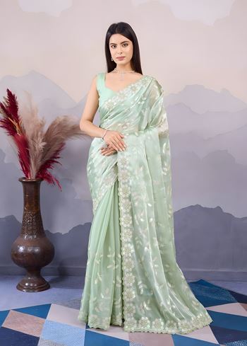 Pista Burberry Silk Saree with C Pallu Embroidery with sequins Work