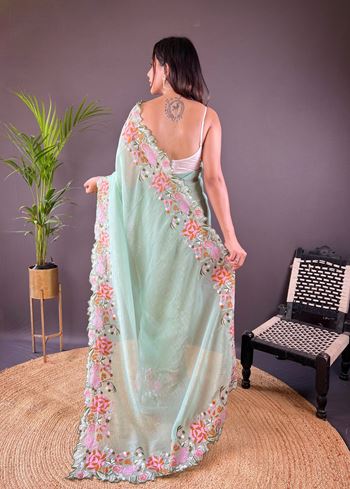 The saree comes with a matching pista green art silk blouse, designed to complement the embroidery and cutwork seamlessly. Its glossy texture ensures a graceful drape and comfortable wear throughout the event. Pair it with elegant jewelry, stylish heels, and a chic clutch to create a refined look that balances contemporary design with traditional flair. Lightweight yet luxurious, this saree is ideal for women who want to make a lasting impression.