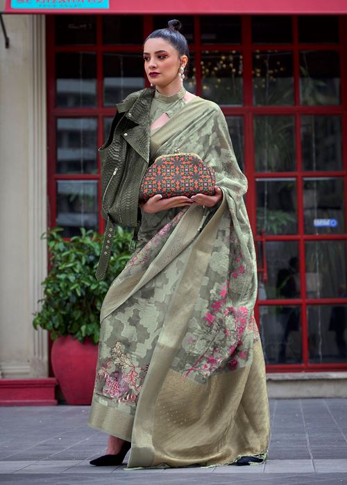 Pista Green Poly Brasso Handloom Silk Saree With Printed Poly Brasso Handloom Waving