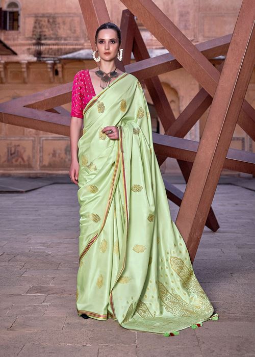 Pista Green Pure Satin Silk Saree With Woven Zari Work