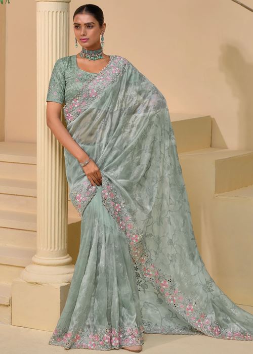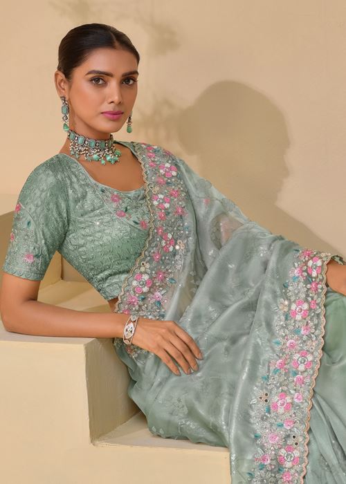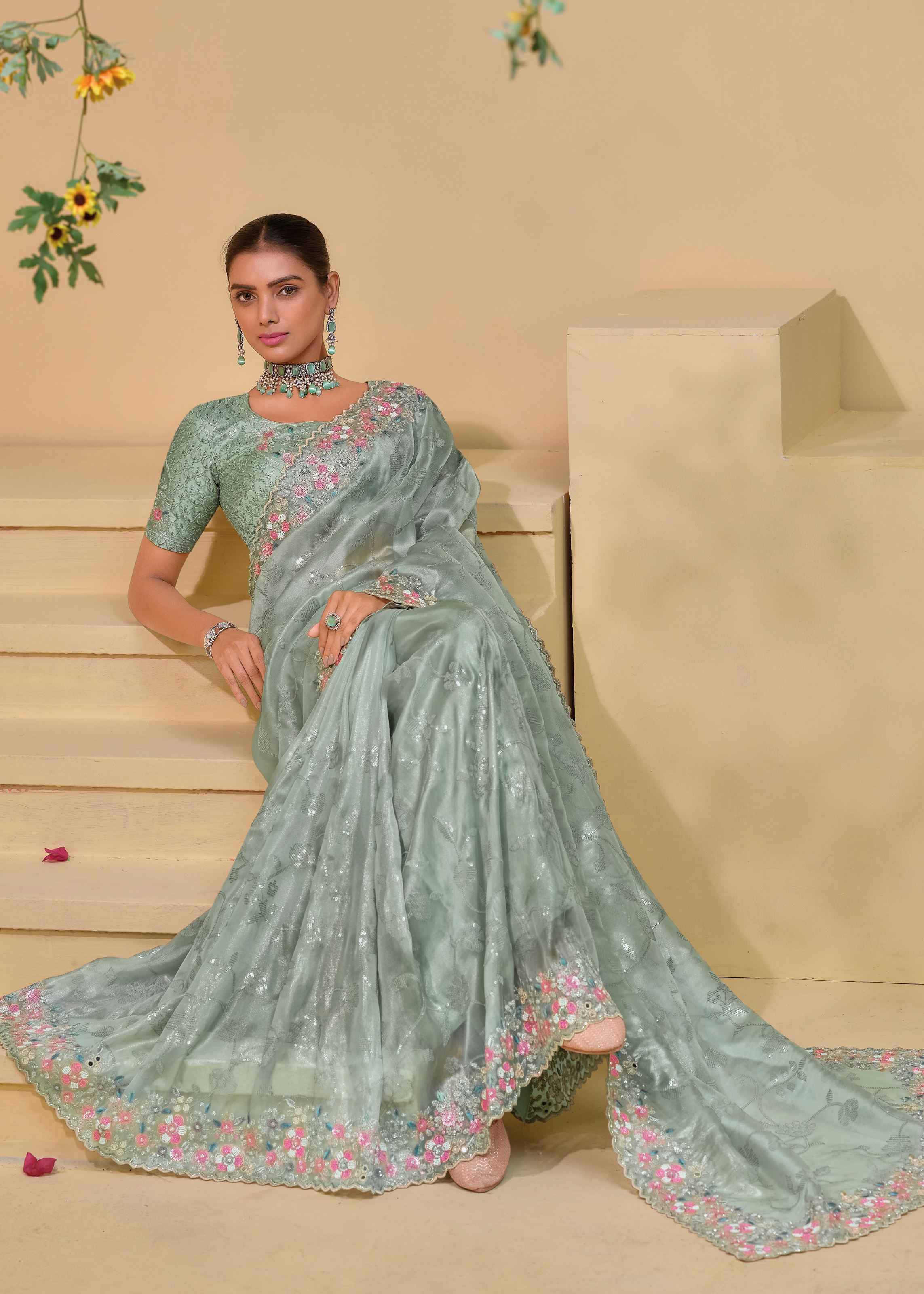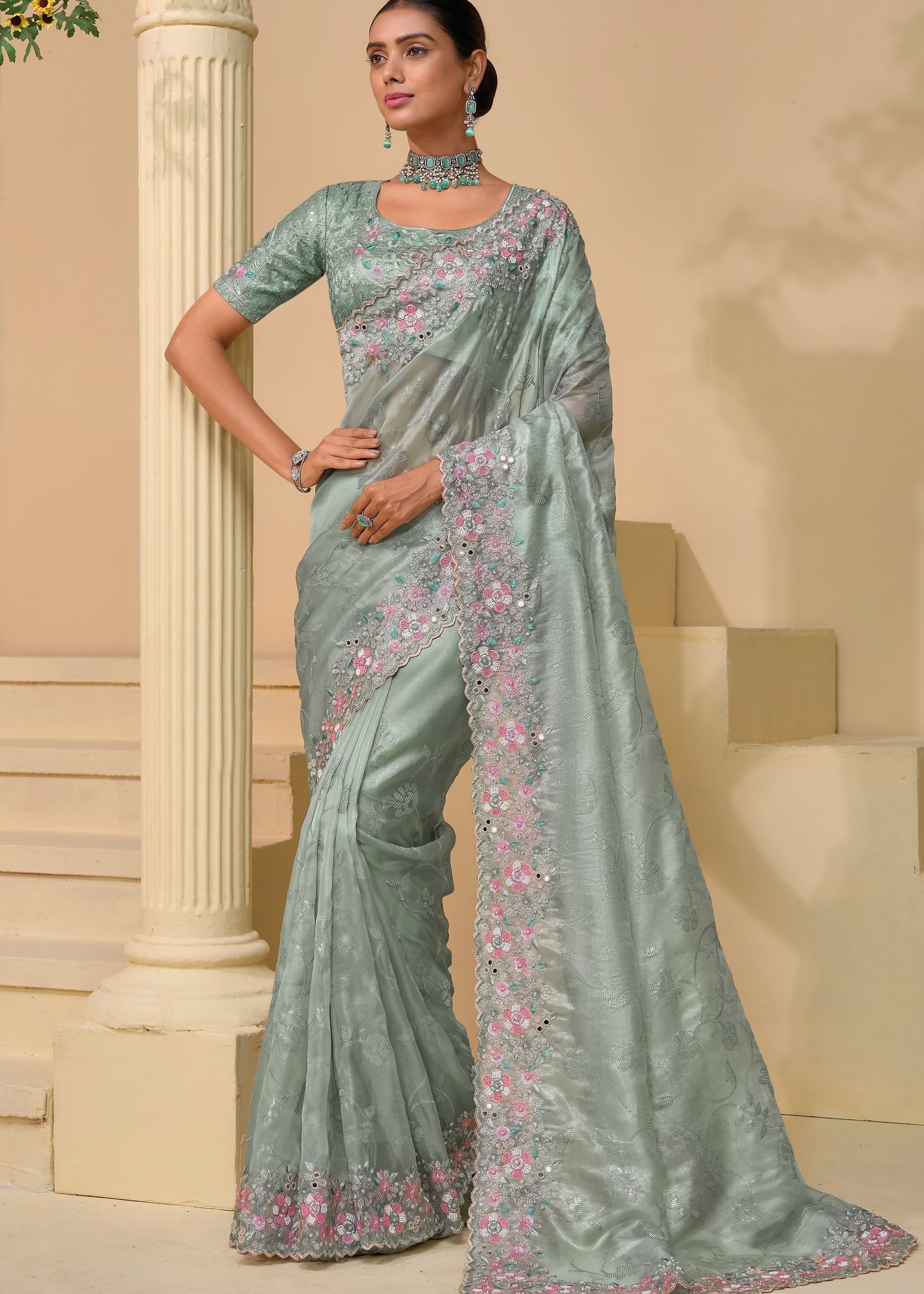 Pista Green Pure Soft Shine Saree With Embroidery, Cut-Dana, Moti With Sequins Work
