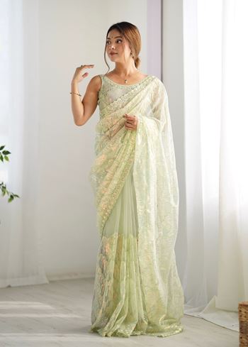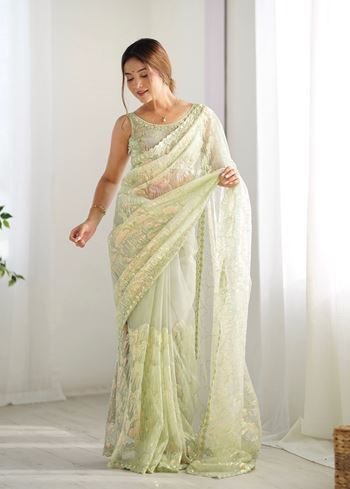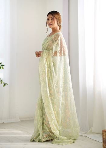 This saree comes with a matching pista green art silk blouse, adorned with embroidered details to create a refined, coordinated look. The combination of delicate net fabric, sparkling sequins, and smooth art silk blouse ensures a stylish yet comfortable drape. Ideal for women who love modern designer sarees while embracing ethnic artistry, this ensemble offers the perfect balance of glamour and grace.