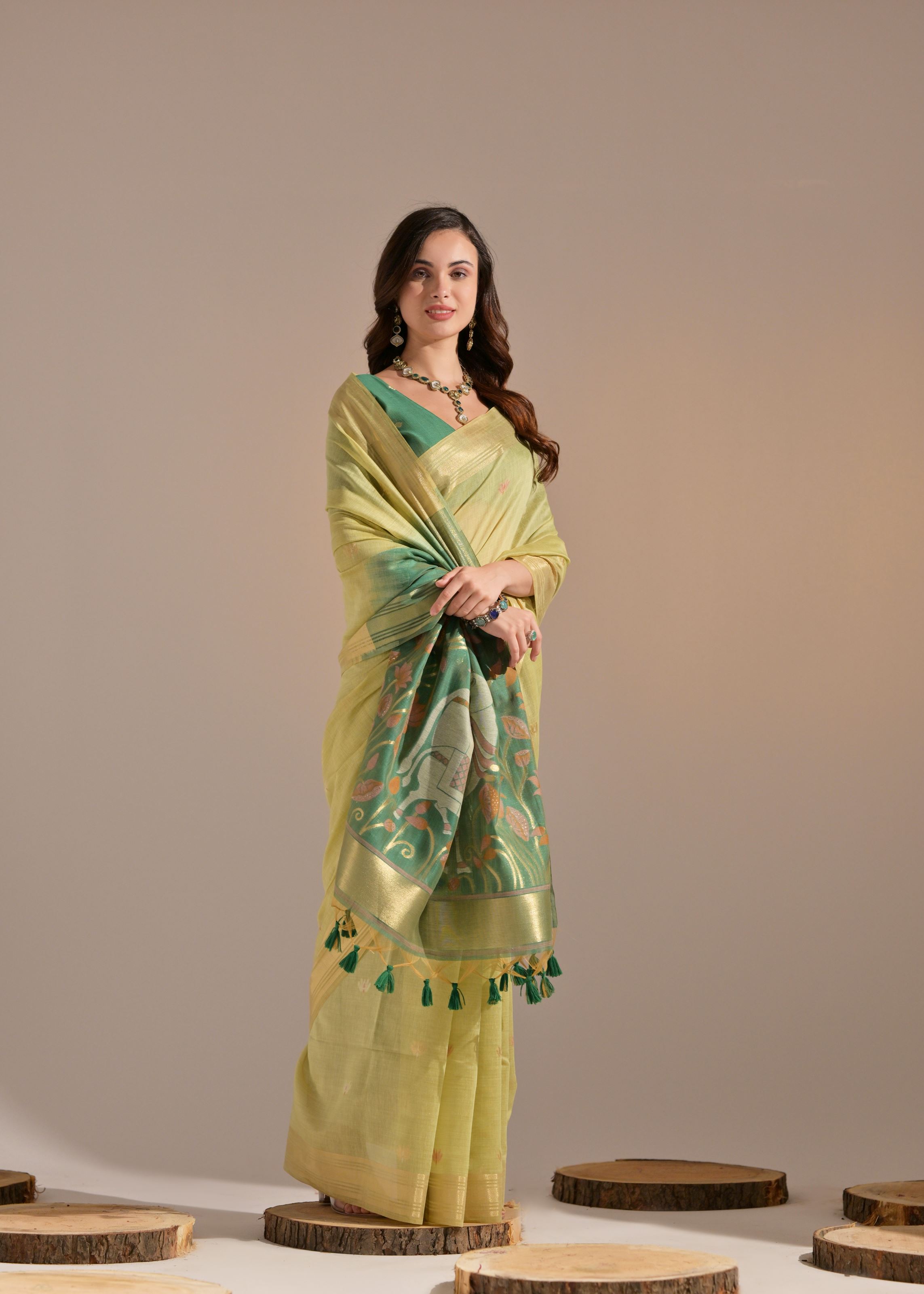 Experience refined ethnic elegance with Aethnofit Fashions’ Pista Muga Cotton Saree—an exquisite creation that blends the richness of traditional design with contemporary grace. Crafted from luxurious Muga cotton, this saree features finely woven cow motifs and classic butti weaves, making it a perfect tribute to timeless Indian craftsmanship.