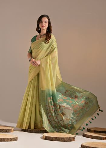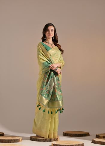 Pista Muga Cotton Saree with Cow Design and Butti Weaves