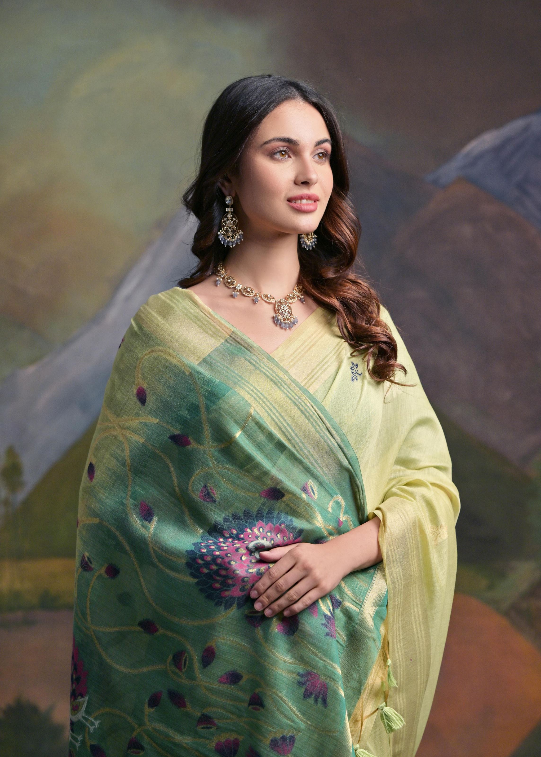 Pista Muga Cotton Saree with Peacock Pallu and Butti Weaves