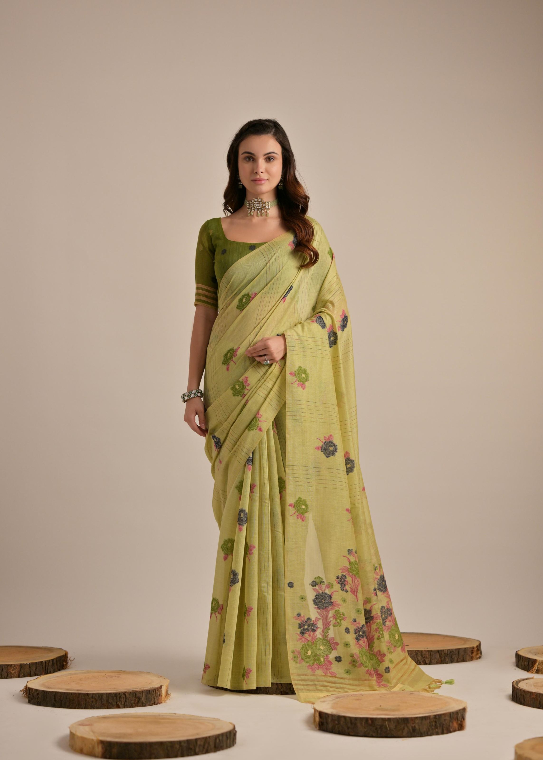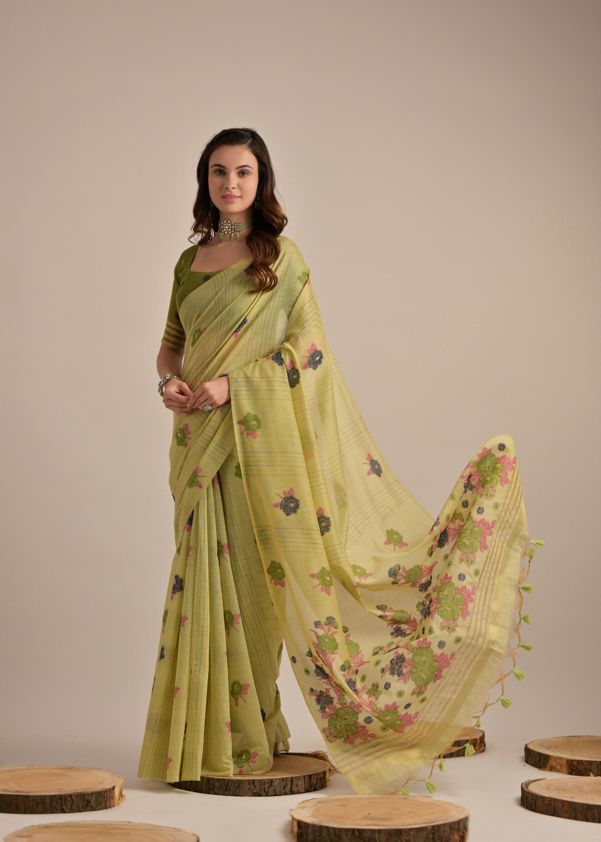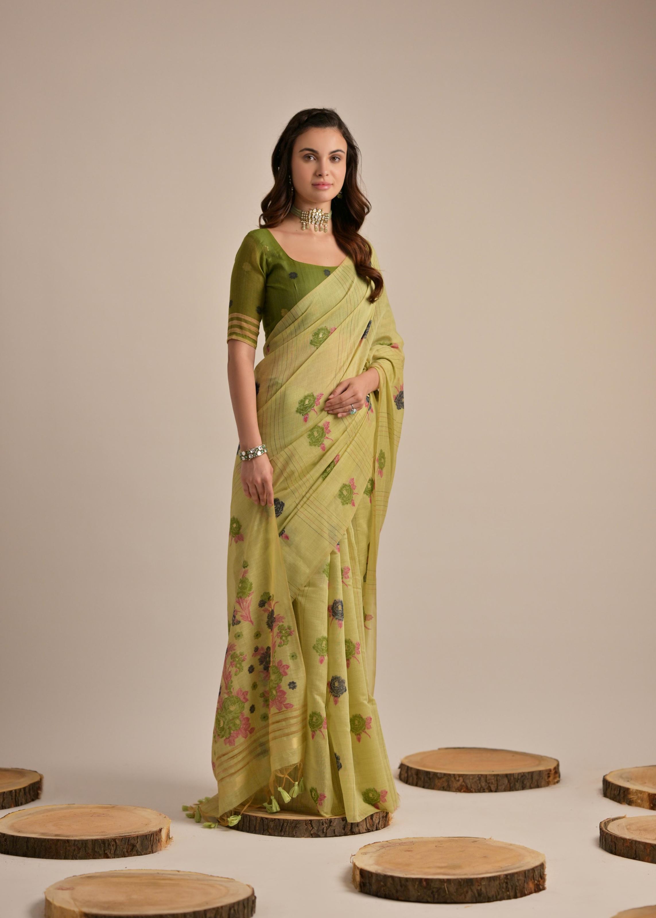 Pista Muga Cotton Saree with Thread Woven Flower Design