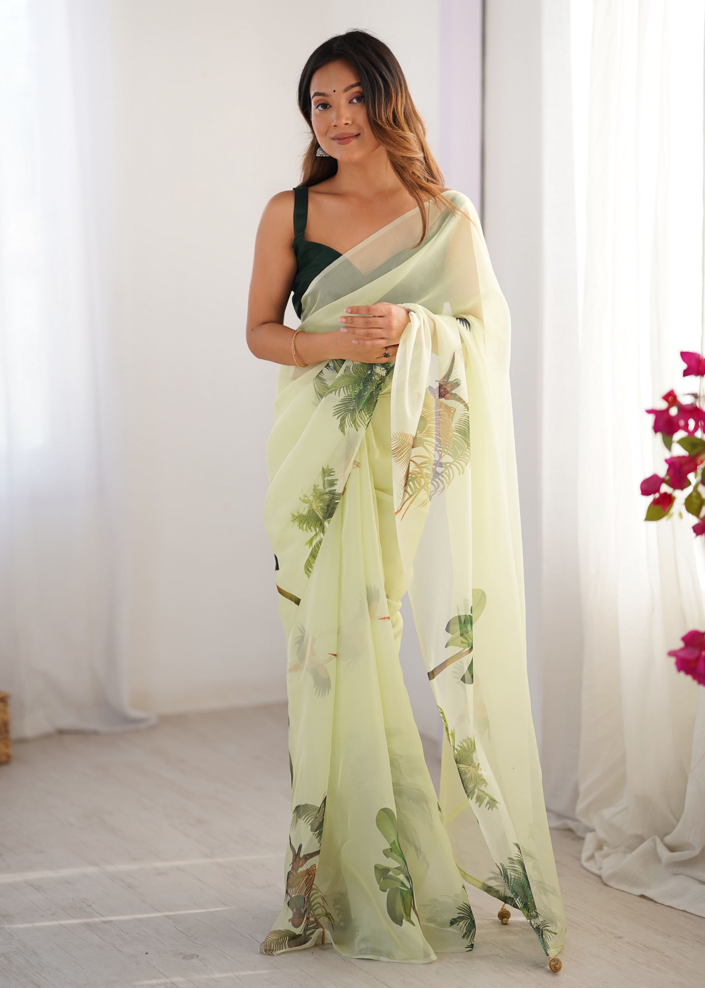 Style this saree with diamond or kundan jewelry for festive events, or opt for sleek accessories for a chic party look. Its graceful design ensures you make a lasting impression, no matter the occasion.Step into elegance with this Pista Organza Printed Saree—a timeless piece designed for women who cherish class, comfort, and contemporary fashion.