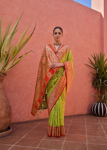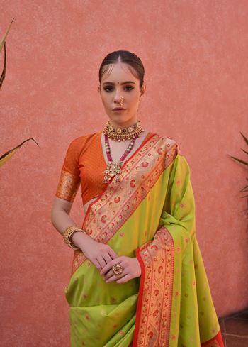 Adding a vibrant twist is the contrasting orange Paithani silk blouse, which enhances the overall look with a bold yet elegant touch. The harmonious play of pista green and orange infuses freshness and vibrancy, perfect for both day and evening functions.