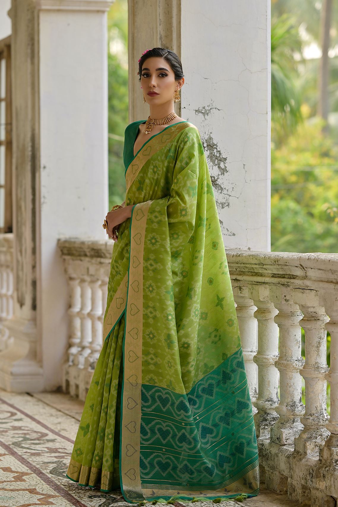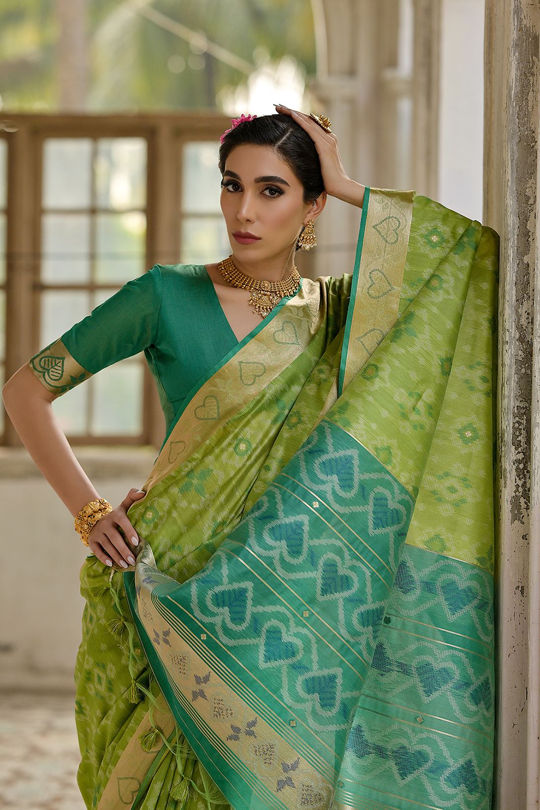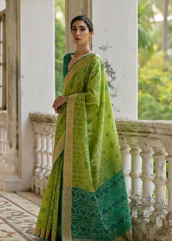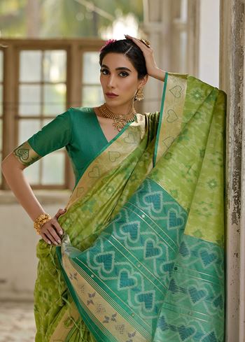 The refreshing pista green hue evokes a sense of grace and serenity, while the beautifully woven green contrast pallu adds depth and vibrancy to the ensemble. Delicate Ikkat weaves along the body showcase heritage craftsmanship, making this saree a fine blend of tradition and contemporary appeal.
