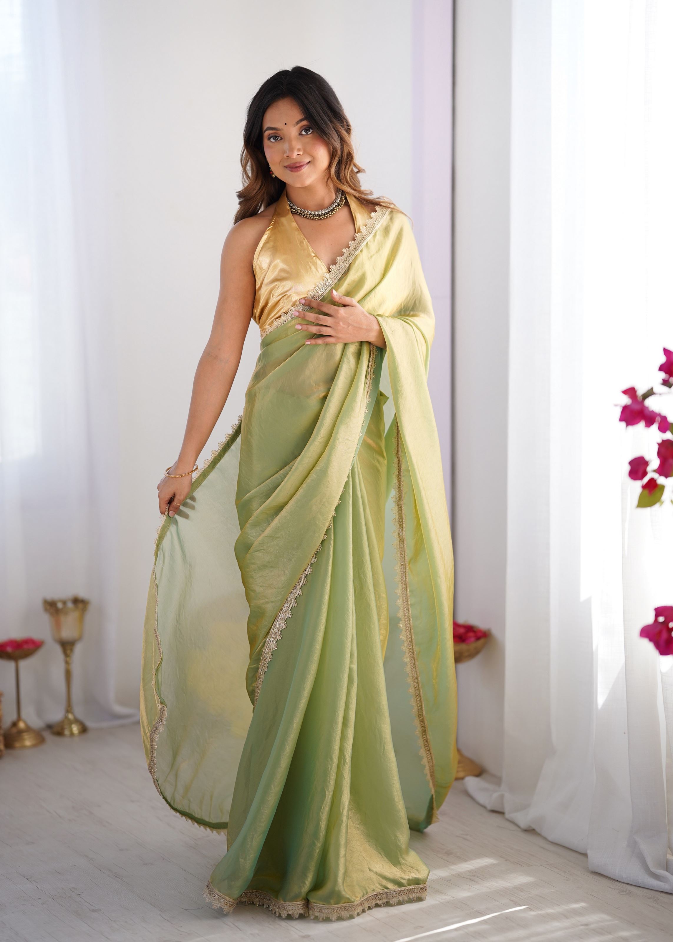 Pista Satin Gold Organza Solid Designer With Lace Border Bollywood Style Saree