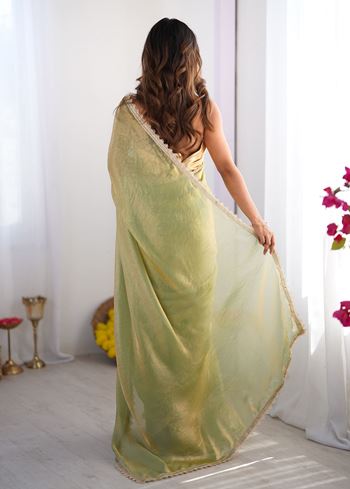 Step into the spotlight with the Pista Satin Gold Organza Solid Designer With Lace Border Bollywood Style Saree from Aethnofit Fashions. Crafted from premium organza fabric, this saree comes in a refreshing pista green shade that radiates charm and sophistication. The shimmering lace border elevates its appeal, giving you the perfect Bollywood-inspired statement look.