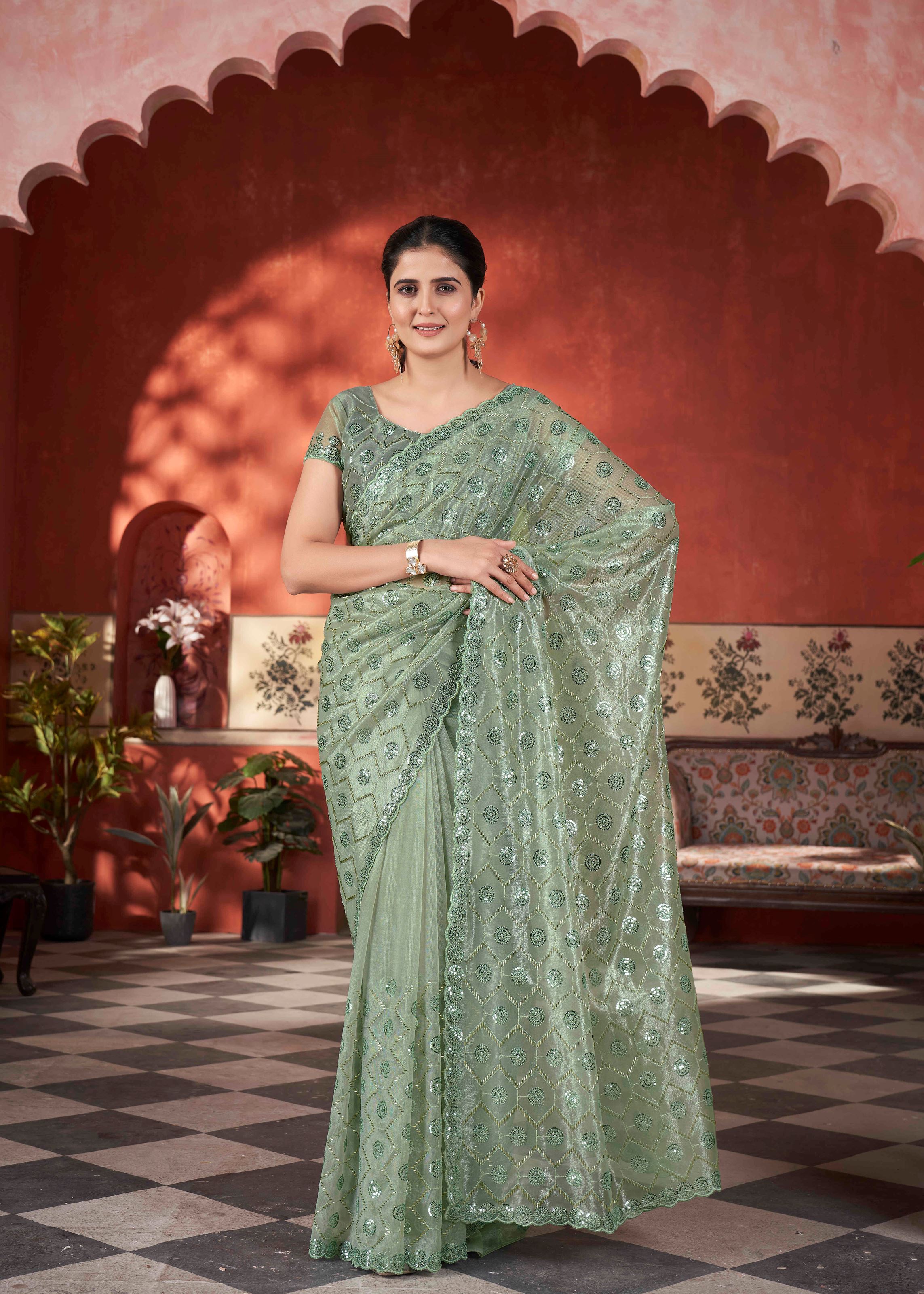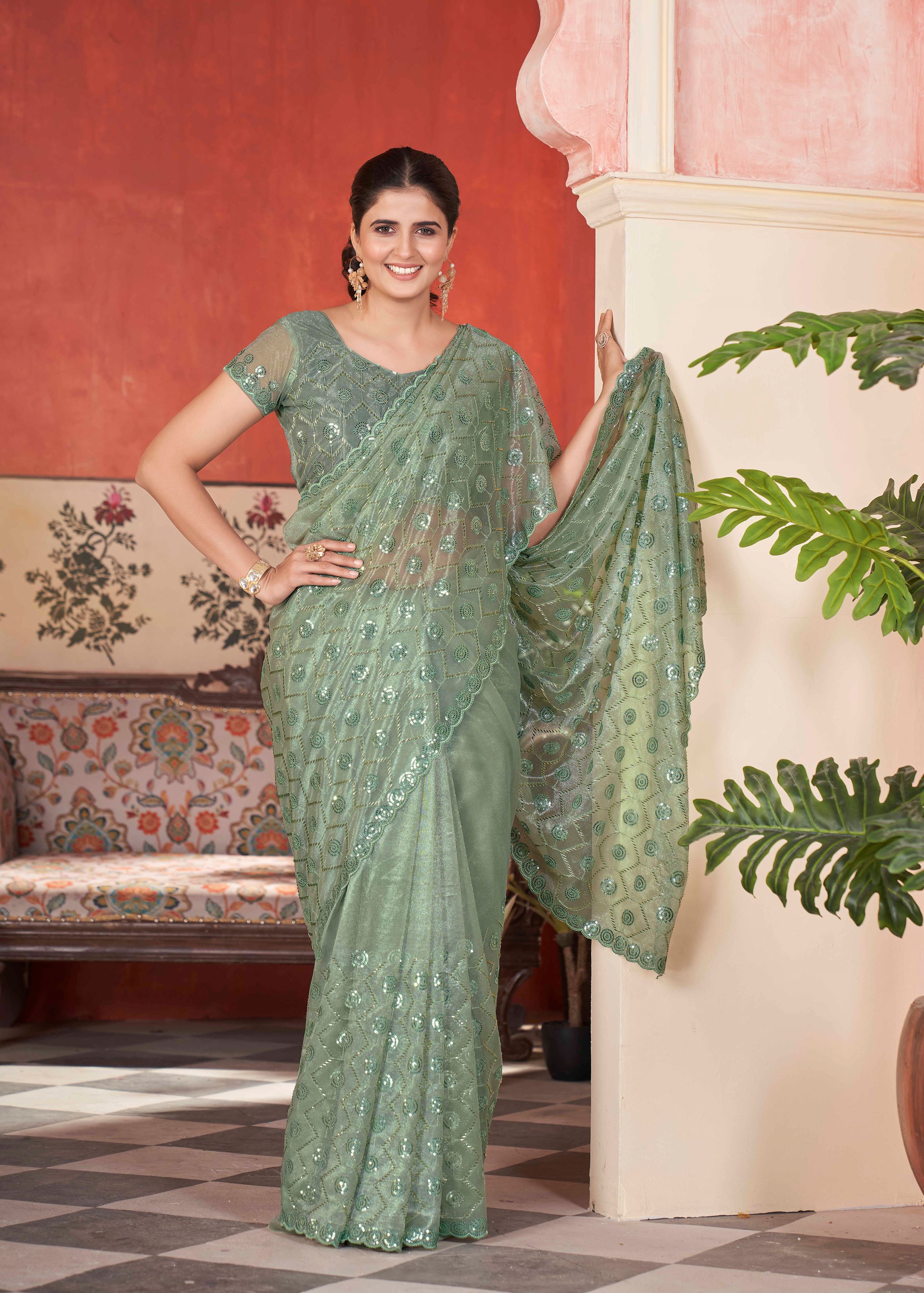 With Aethnofit Fashions, you can now shop sarees online in premium fabrics like silk, cotton, chiffon, georgette, and more. This pista tissue saree is part of our specially curated designer range that highlights the best blend of traditional artistry with modern appeal. It is also an excellent choice for those looking for affordable sarees for sale without compromising on style and quality.Discover our exclusive online saree boutique featuring handwoven Banarasi, luxurious Kanjeevaram, bridal sarees, and trendy party wear. Our $1 stitching option ensures your blouse is tailored for a perfect fit, making your shopping experience seamless.We deliver worldwide, with quick shipping available across the globe, including the USA. Choose Aethnofit Fashions and indulge in timeless ethnic wear with a glamorous twist.