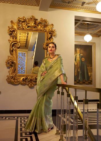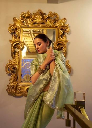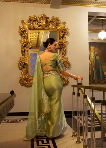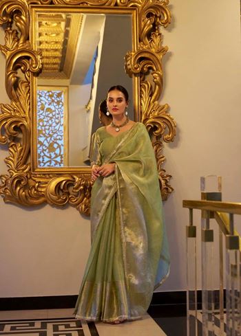 Pista Tissue Shimmer Saree with Zari Weaving & Sequins Lace