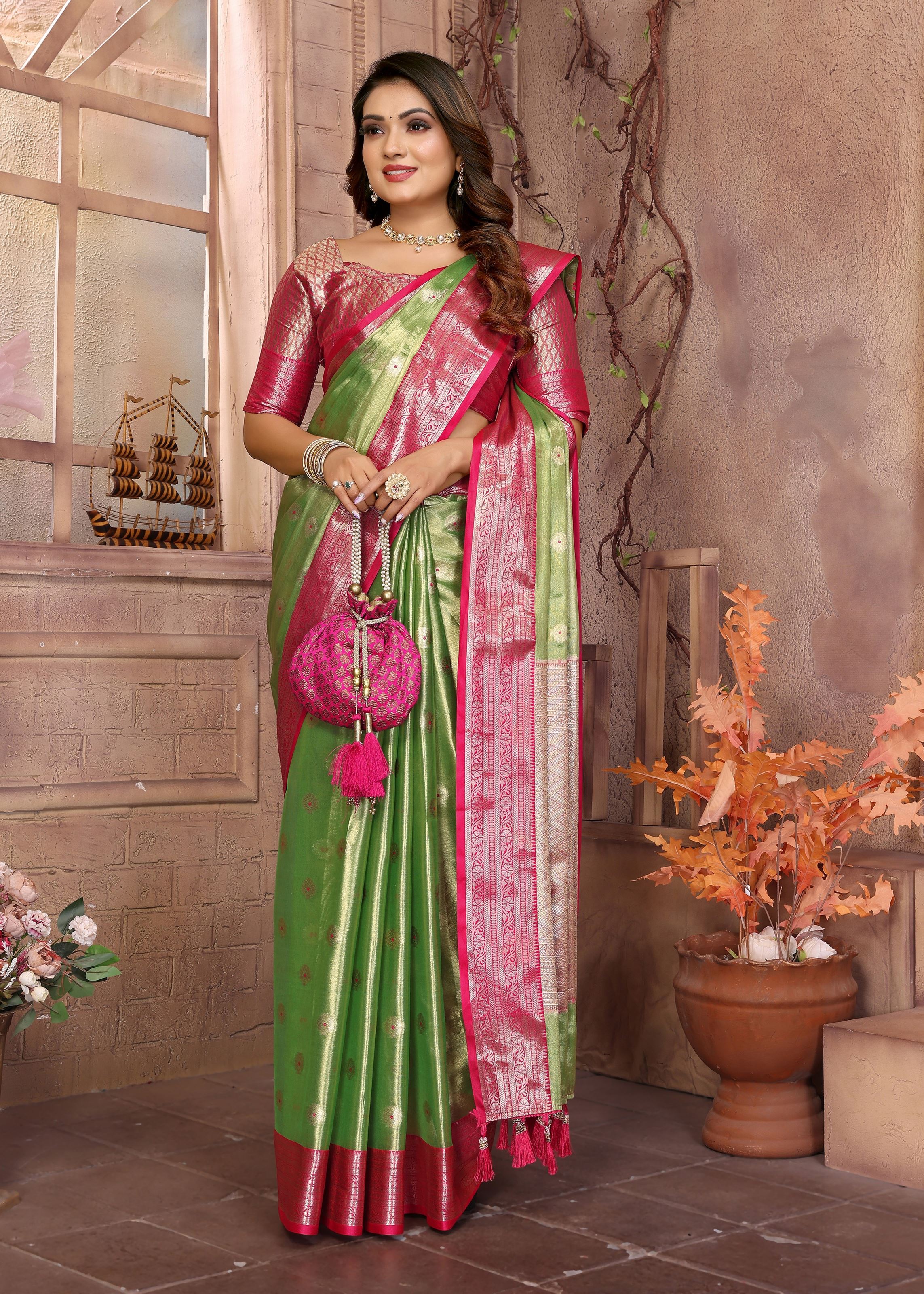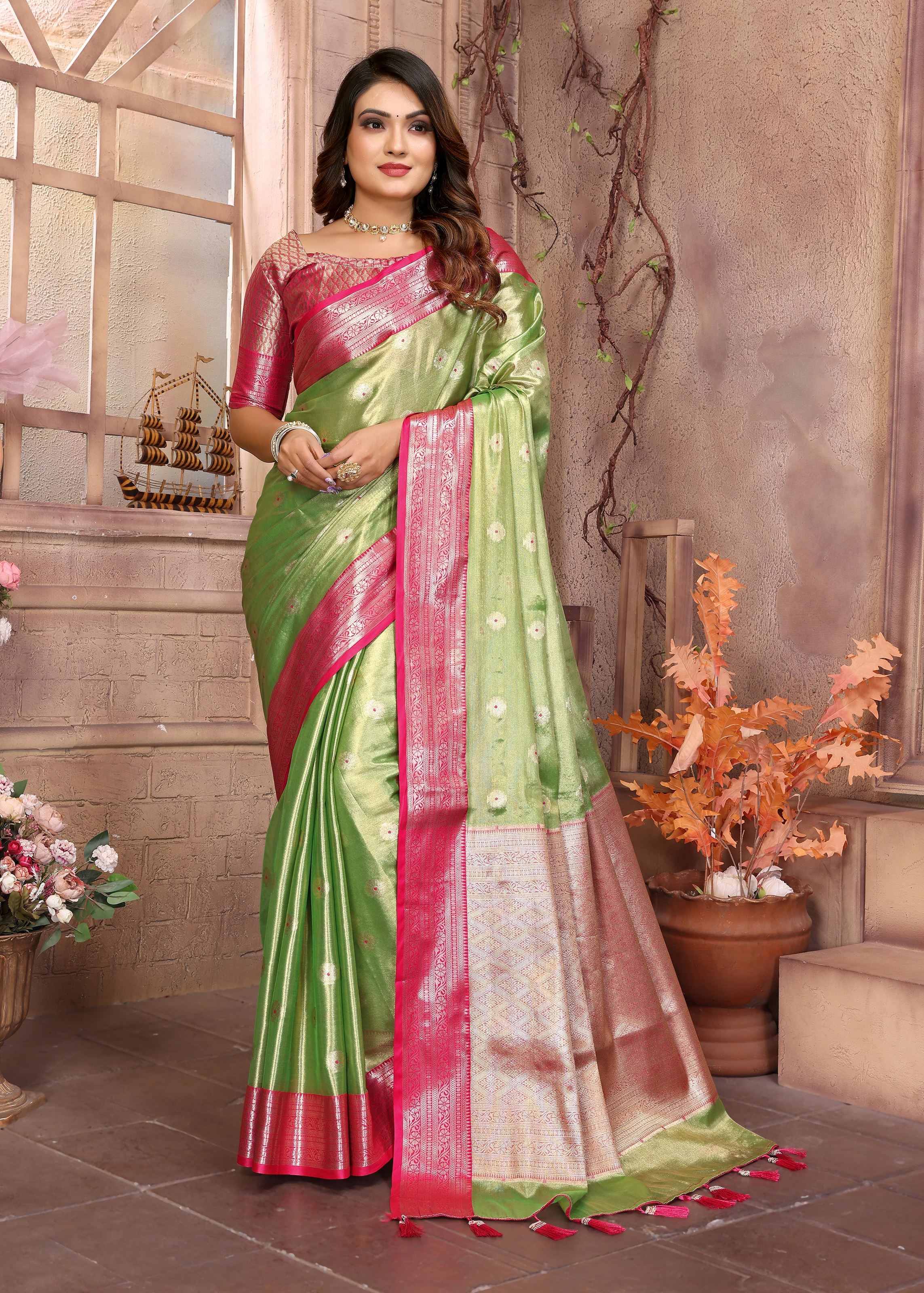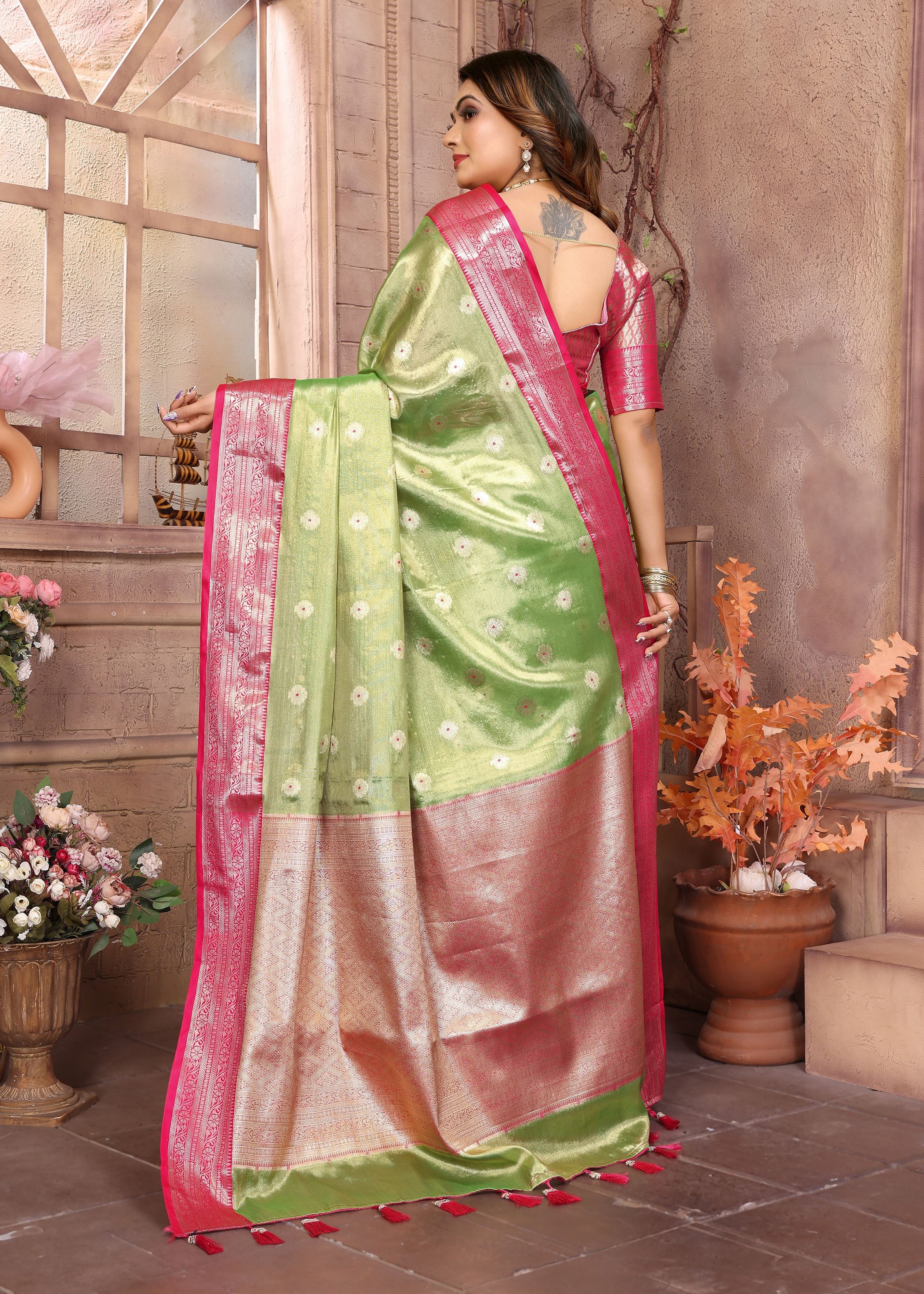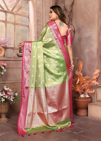 Pista Tissue Silk Ethnic Saree With Woven Handloom Designer
