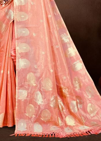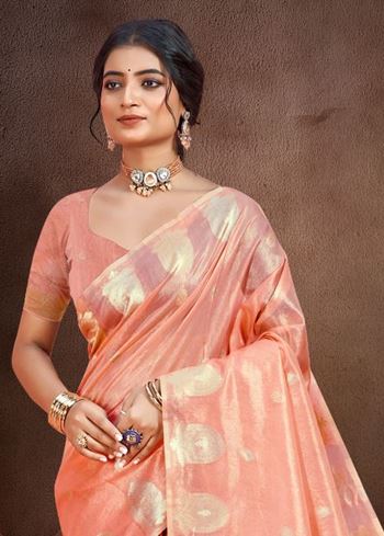 The enchanting gajri (soft pink) hue radiates charm and femininity, making it a perfect choice for both daytime festivities and evening functions. Its natural sheen adds a subtle sophistication, while the fluid drape enhances your silhouette with grace. The saree comes with a perfectly matching Munga Kota blouse, maintaining a cohesive and polished festive look.
