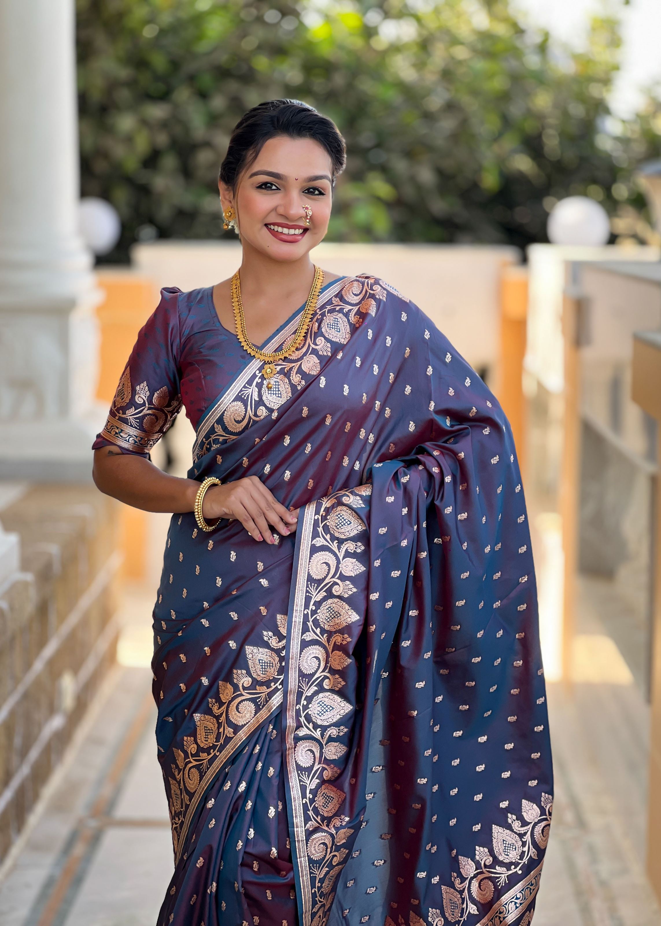 Add a regal charm to your wardrobe with this Purple Banarasi Silk Saree from Aethnofit Fashions, crafted to perfection for weddings, receptions, and festive occasions. Made from a luxurious silk blend, this saree features intricate woven jacquard work, showcasing timeless Banarasi craftsmanship with a contemporary twist. The rich purple hue radiates elegance and sophistication, making it an ideal choice for women who love traditional fashion with a modern edge. It comes with a matching purple blouse in the same silk blend fabric, ensuring a perfectly coordinated look.