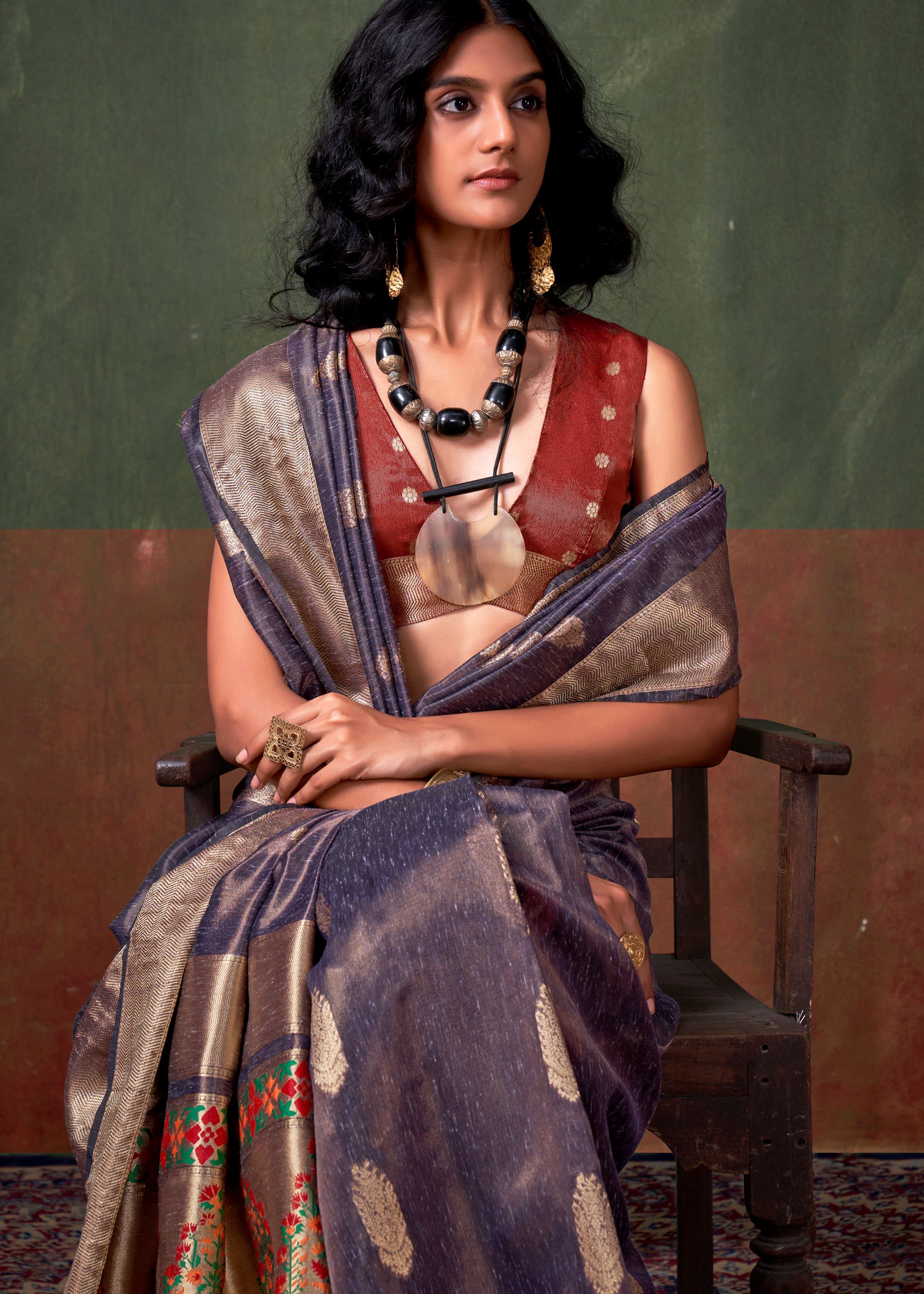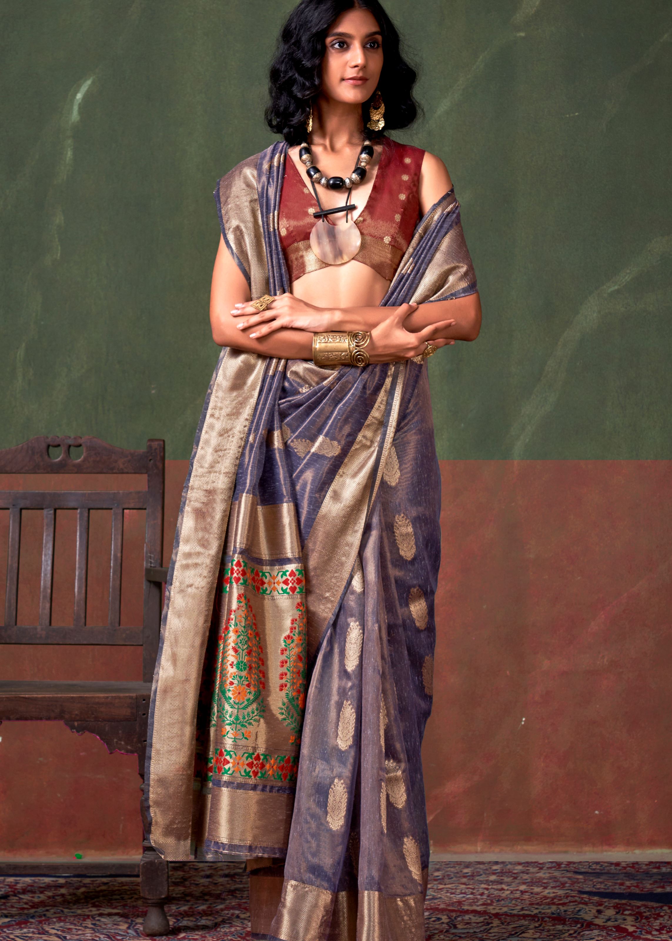 The saree is thoughtfully paired with a contrasting dark rust tissue silk blouse, creating a striking yet balanced ensemble. The blouse, also adorned with jacquard woven detailing, adds sophistication to the overall look. Whether it’s a festive occasion, a formal gathering, or a pre-wedding function, this saree ensures you’ll turn heads with its elegant craftsmanship and contemporary appeal.