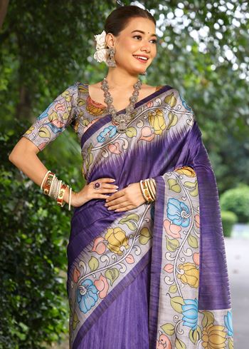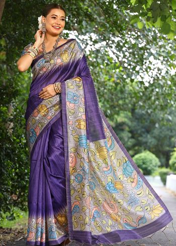 The saree features a rich purple solid body, exuding poise and understated luxury. This simplicity is beautifully contrasted by a vibrant printed pallu, which introduces artistic flair and cultural charm to the ensemble. The design makes it an ideal pick for festive occasions, office wear, or relaxed gatherings where elegance is key.