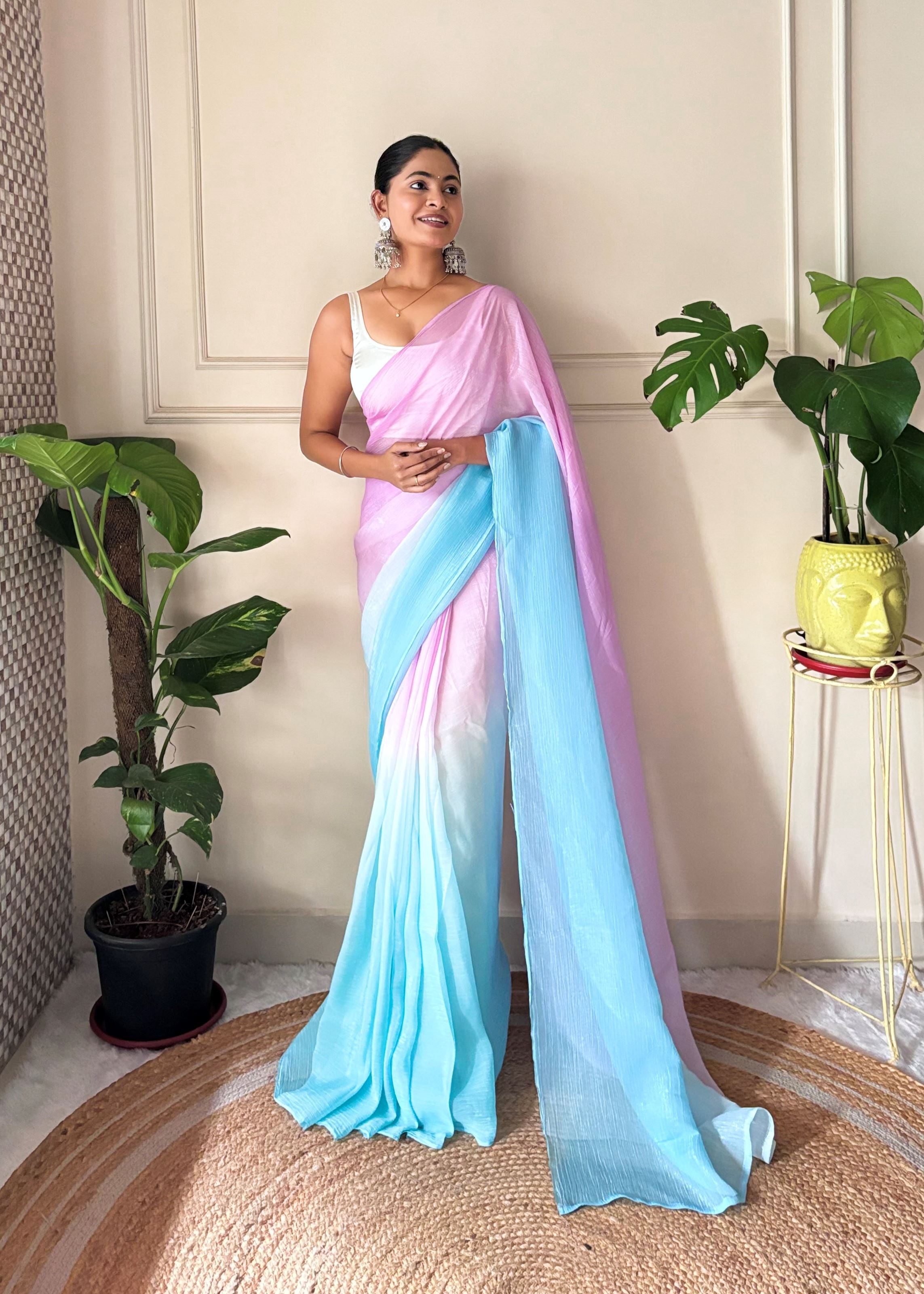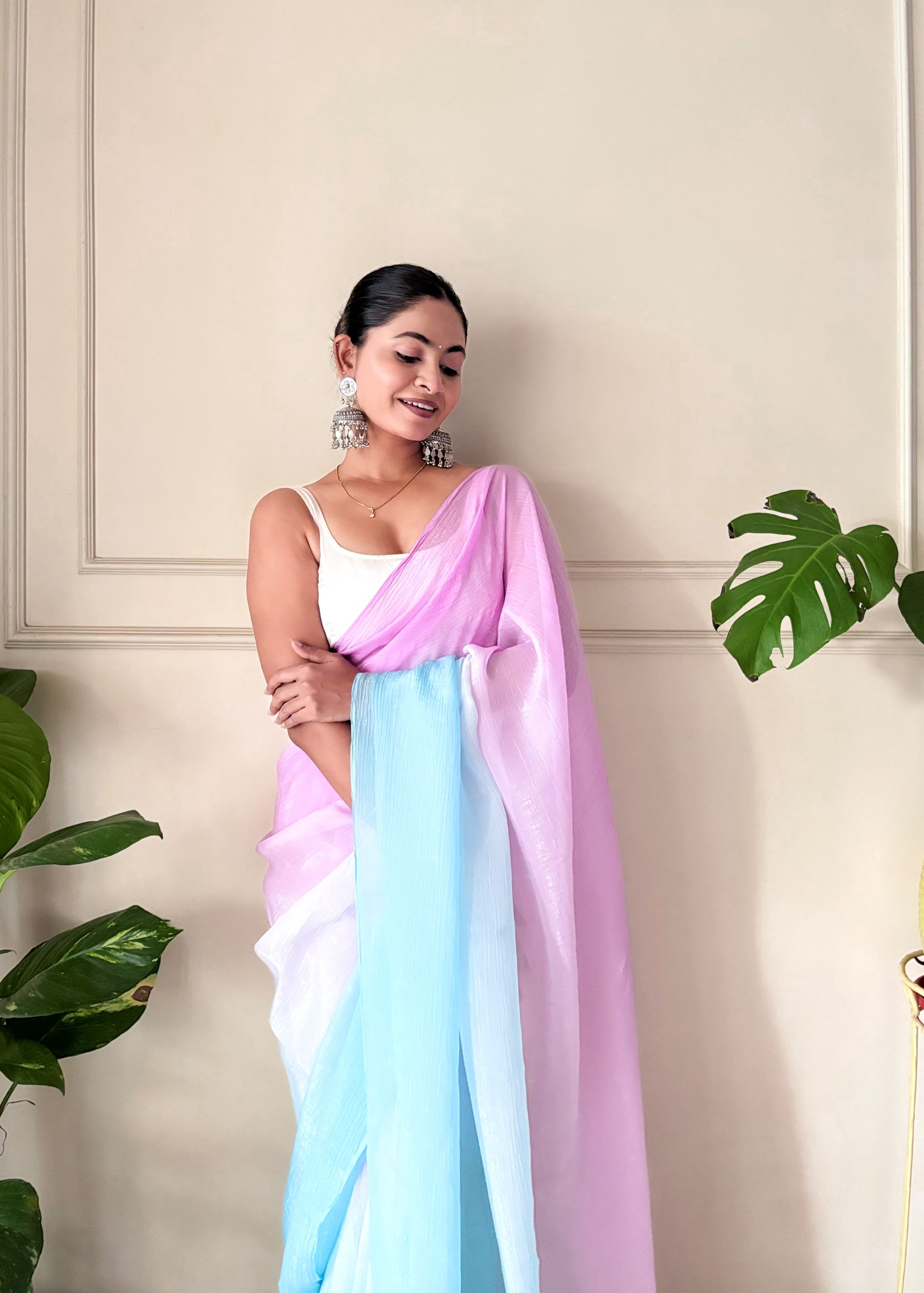 This saree comes with a contrasting white art silk blouse, adding a stylish twist to the overall look. The blouse fabric ensures comfort while maintaining a luxurious touch, allowing you to experiment with modern or traditional styling. Pair this ensemble with dazzling accessories and high heels to create an effortlessly glamorous appearance.Ideal for cocktail parties, weddings, and evening events, this Purple Crunchy Pedding Bollywood Style Saree promises to make you stand out with its fashionable design and premium quality. Experience the ease of ready-to-wear comfort without compromising on the charm of traditional attire.