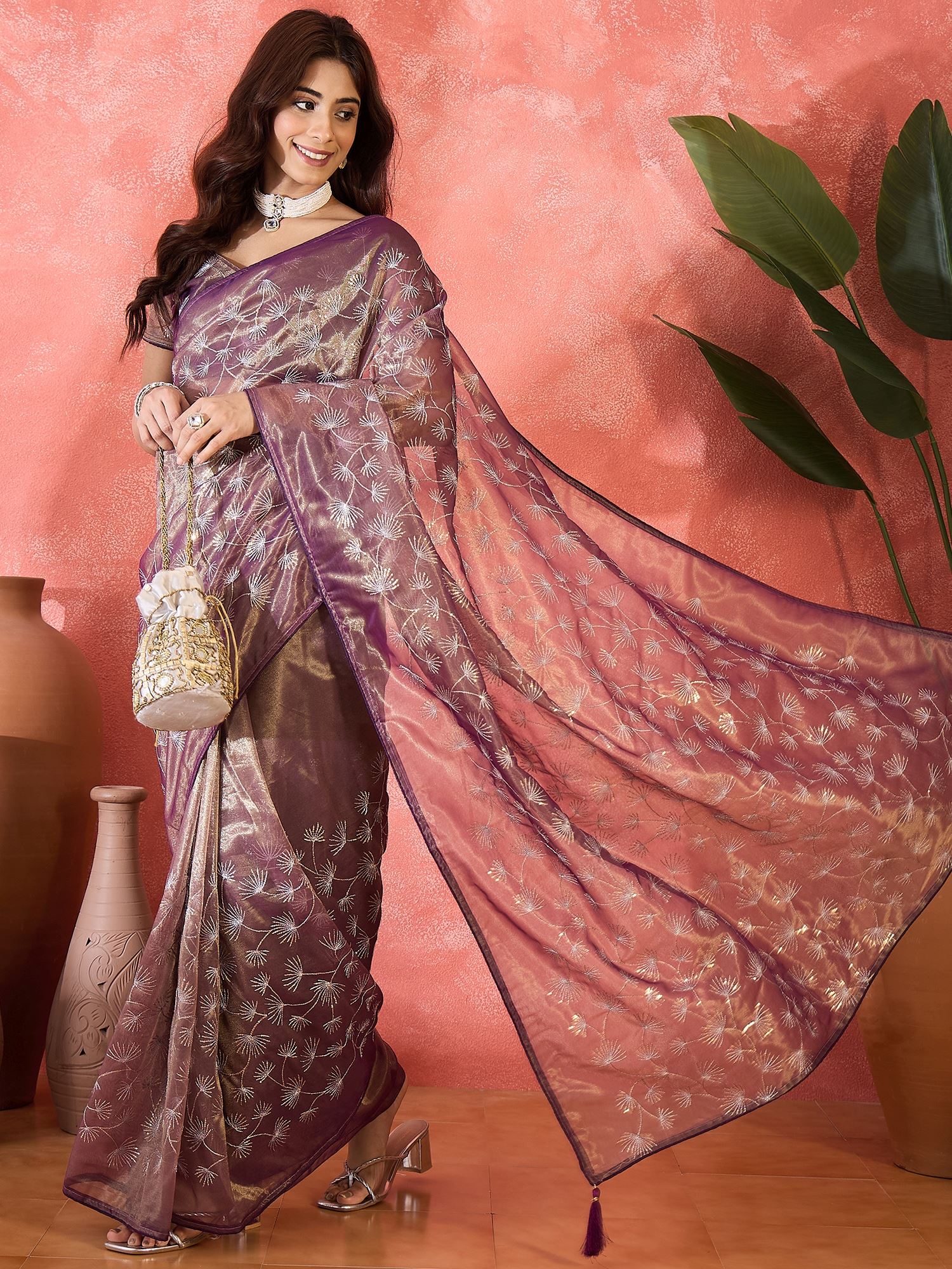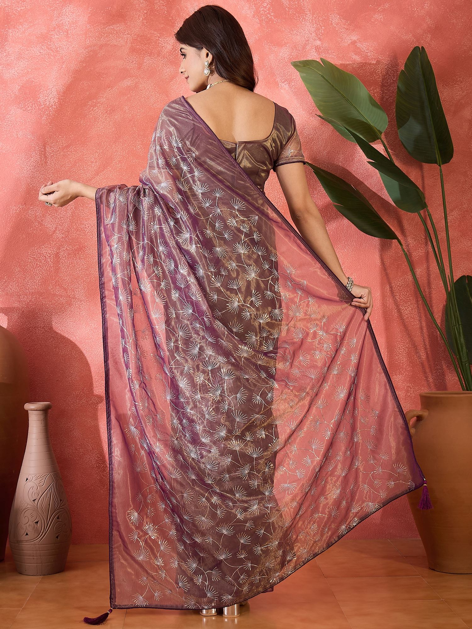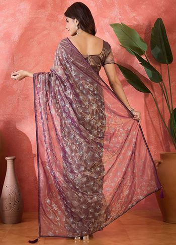 Purple Designer Twill Net Sequins Embroidery Work Saree
