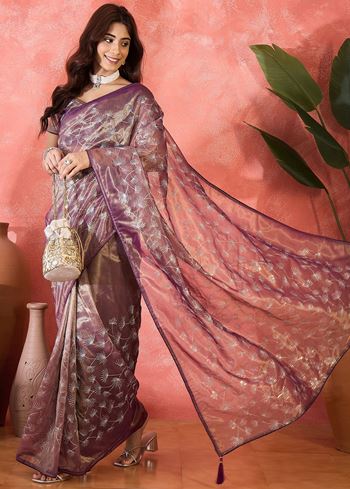 The vibrant purple shade symbolizes royalty and charm, ensuring that you stand out at every occasion. This saree comes with a matching purple net blouse, maintaining a seamless and chic appearance. Its combination of contemporary styling and ethnic allure makes it an excellent addition to your designer collection.