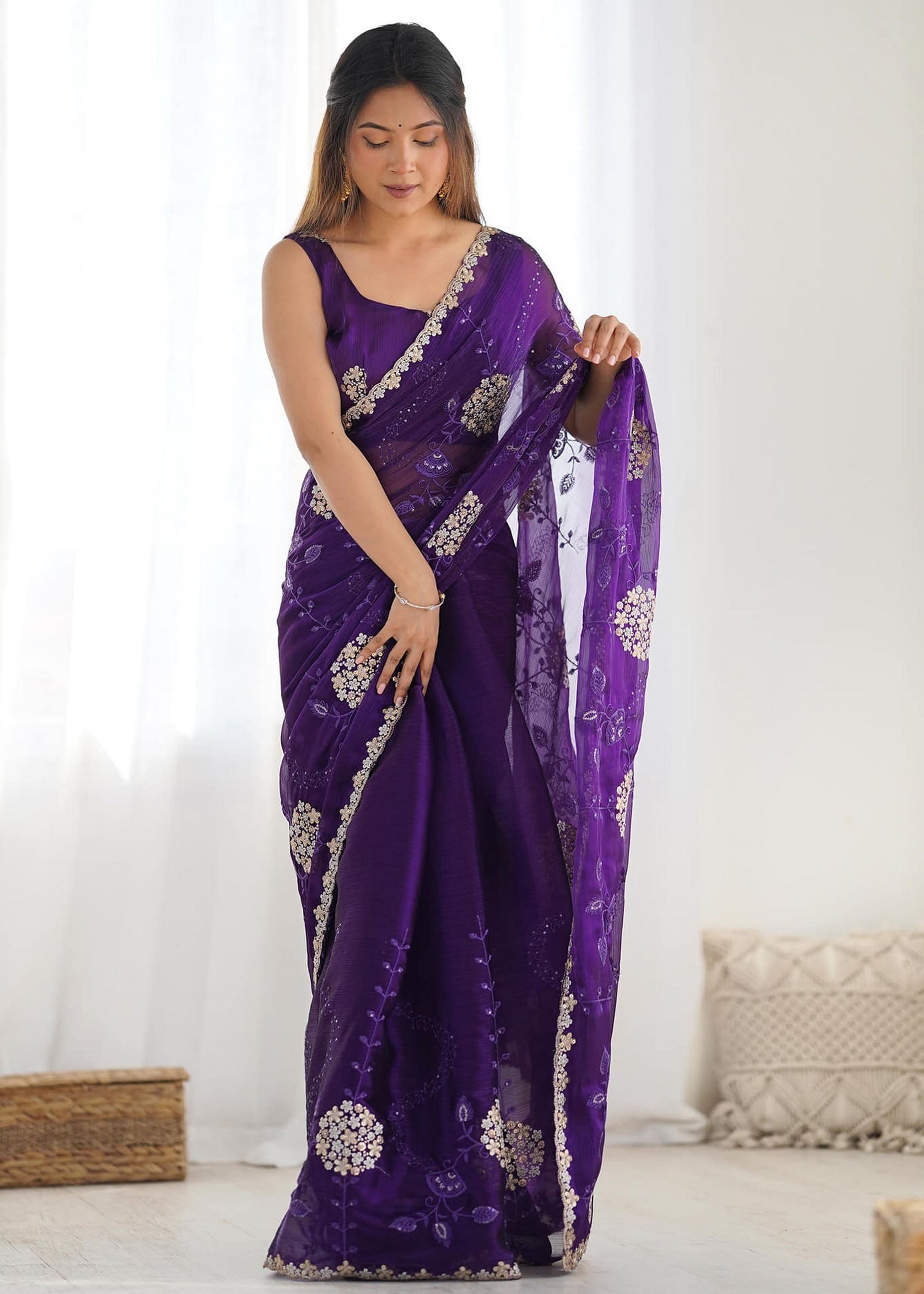The stunning purple hue symbolizes sophistication and charm, while the exquisite embroidered detailing adds a rich and artistic touch to the ensemble. The matching chiffon blouse in the same purple shade creates a harmonious look that exudes Bollywood-inspired glamour. Whether you style it with a sleek bun or loose curls, this saree will ensure you look picture-perfect at every event.