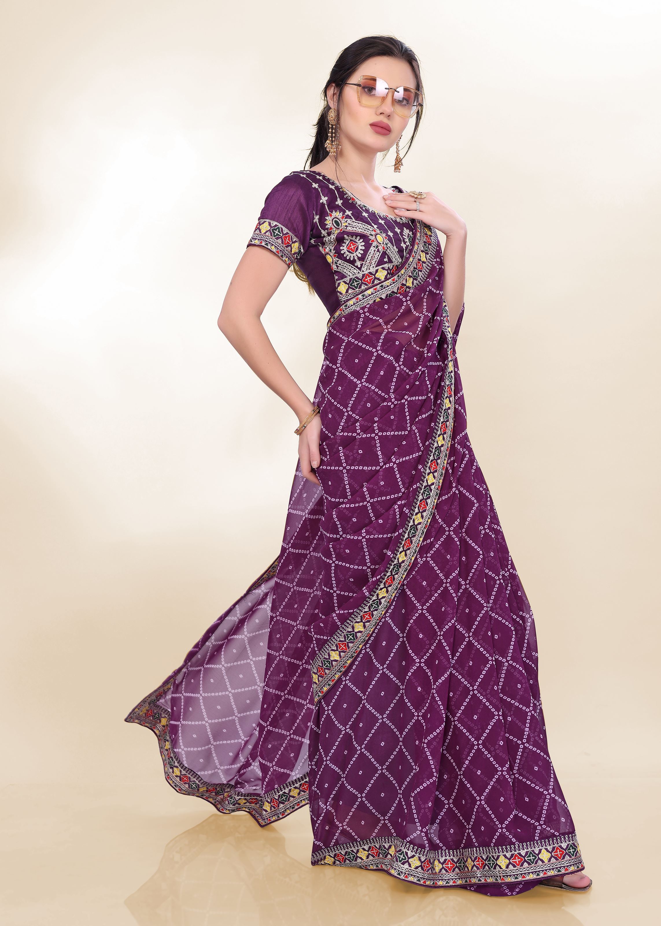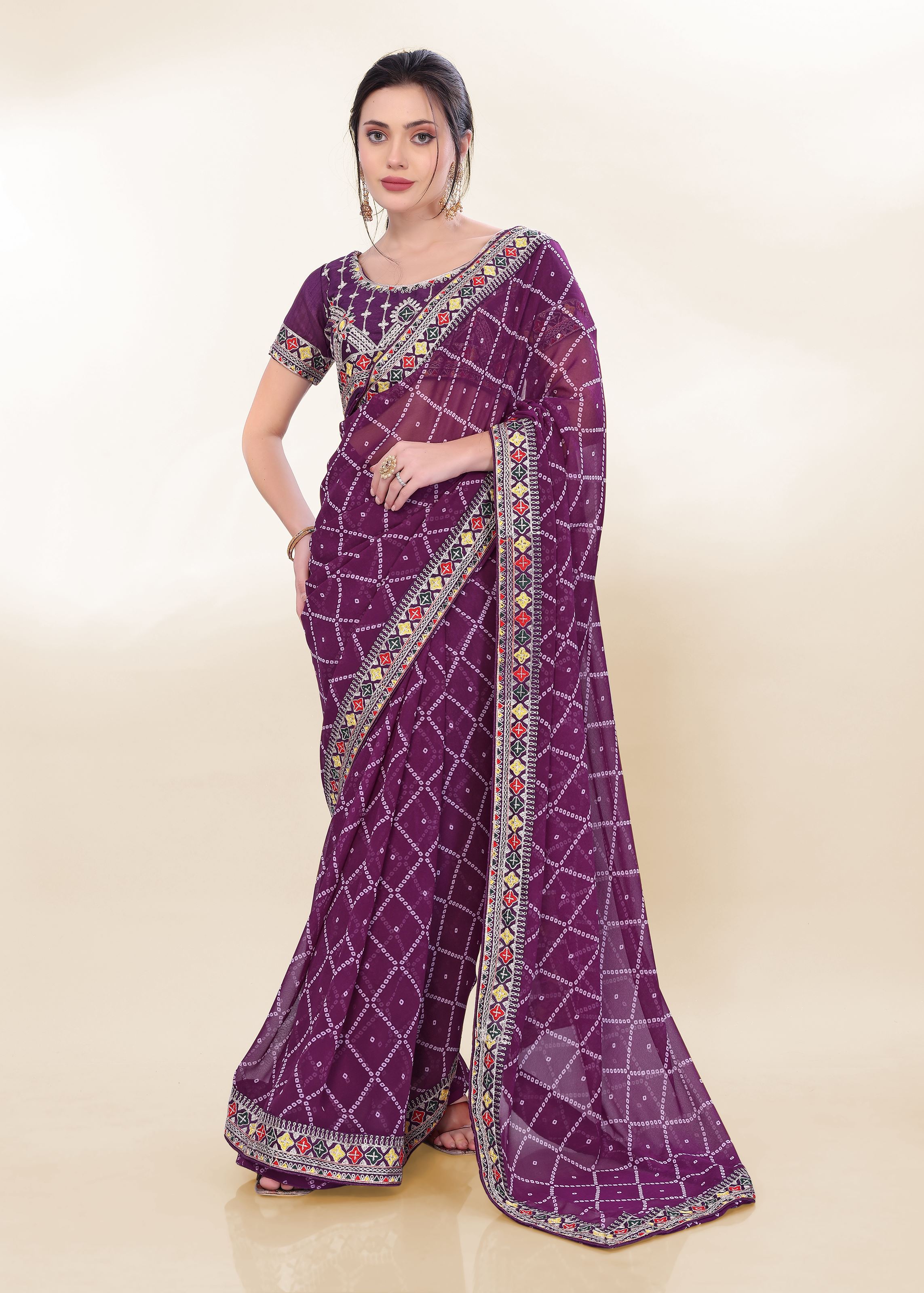 Purple Georgette Bandhej Printed Saree With Graceful Embroidery Work