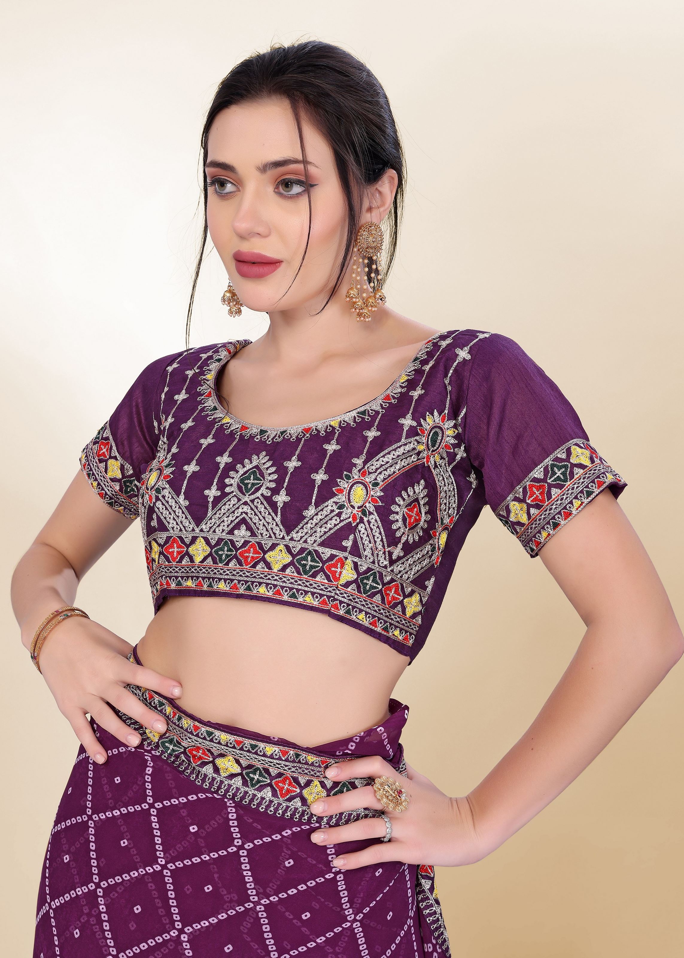 This ensemble comes with a matching purple art silk blouse, allowing you to create a coordinated and stylish outfit effortlessly. Pair it with traditional jewelry, embellished sandals, and a stylish clutch for an eye-catching ethnic look that stands out.Ideal for festive occasions, cultural ceremonies, and evening events, this Purple Georgette Bandhej Printed Saree with Embroidery Work is a versatile addition to your wardrobe. Step into the spotlight with this timeless piece that celebrates Indian artistry and fashion.