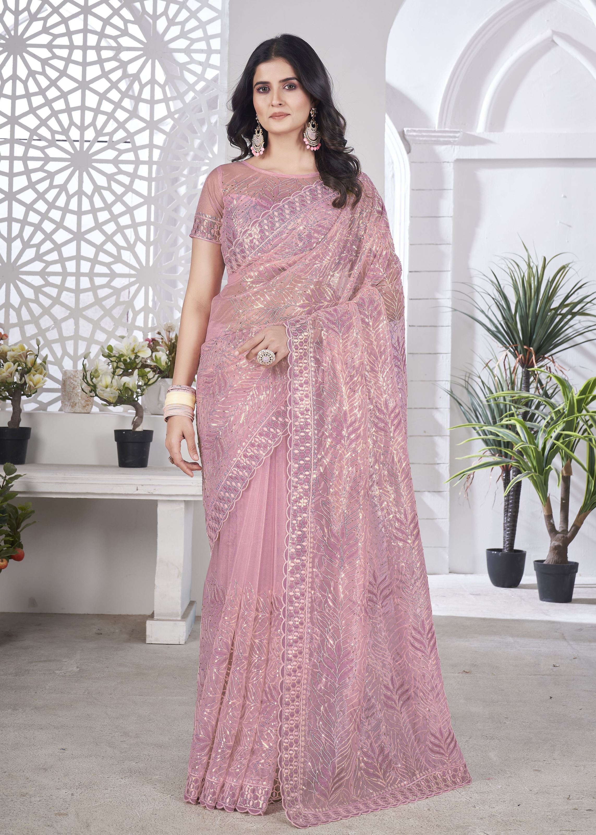 Purple Girlie Tissue Net Designer Embroidered Saree