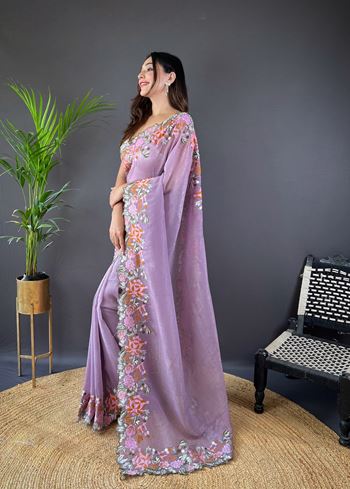 Purple Glossy Silk Cross Stich Embroidery Cut Work Adorable Partywear Girlie Saree