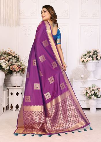 Paired with a contrasting blue silk blend blouse, this saree forms a striking and graceful ensemble, ideal for weddings, festive occasions, and cultural celebrations. The rich purple hue enhances its regal appeal, while the delicate zari detailing adds a classic ethnic touch. This designer saree is versatile, combining tradition with modern elegance to create a standout piece for any special occasion.