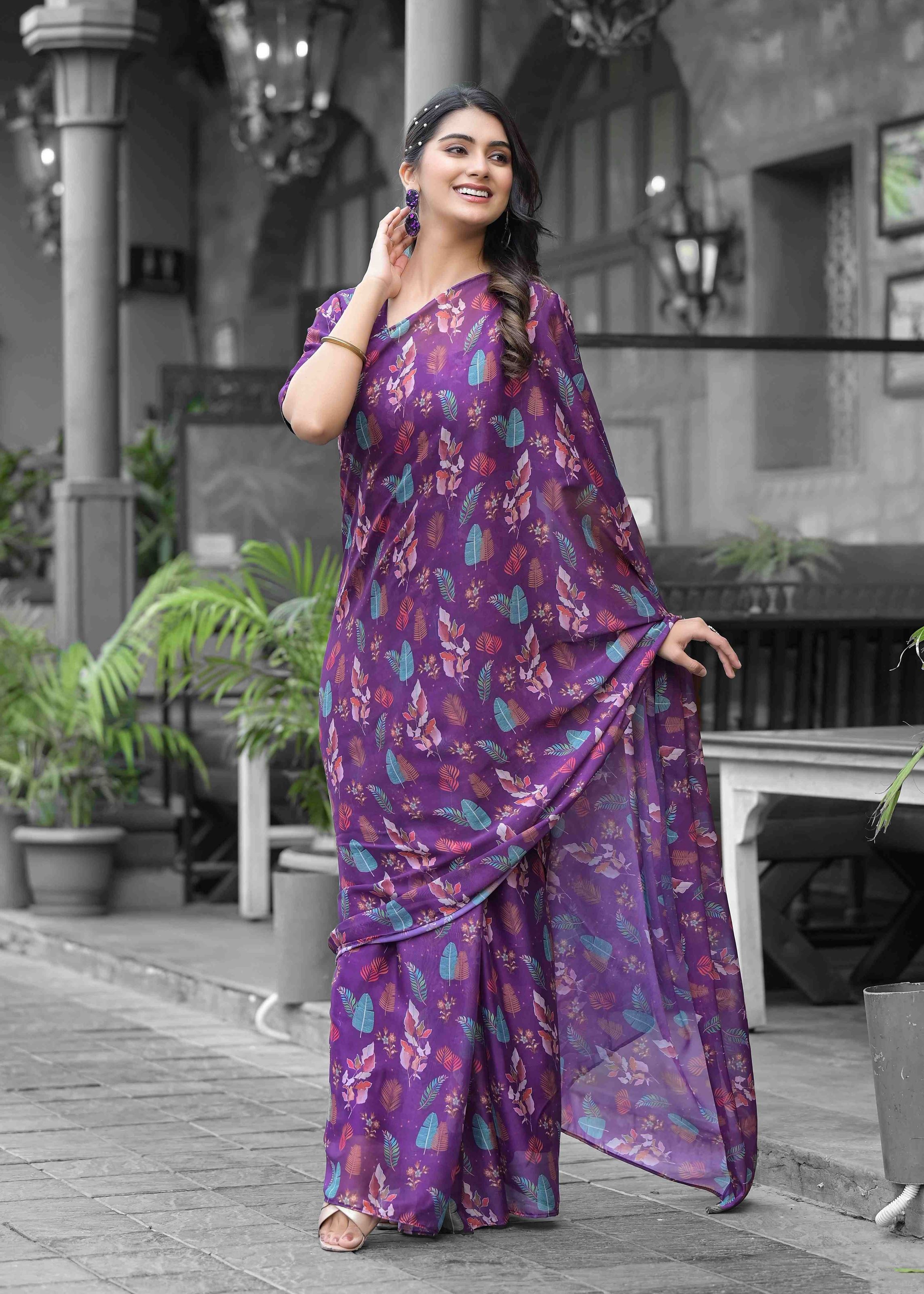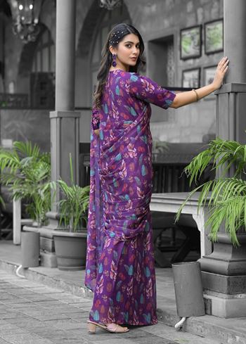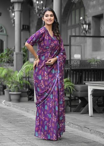 Step into modern elegance with this Purple Imported Georgette Designer Digital Printed Saree, styled in a graceful gown silhouette for a contemporary touch. Made from soft faux georgette, this ready-to-wear saree ensures easy draping and a smooth flow. The digital print adds a striking detail to the vibrant purple shade, while the matching faux georgette blouse in the same tone completes the look with a refined finish.