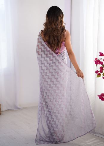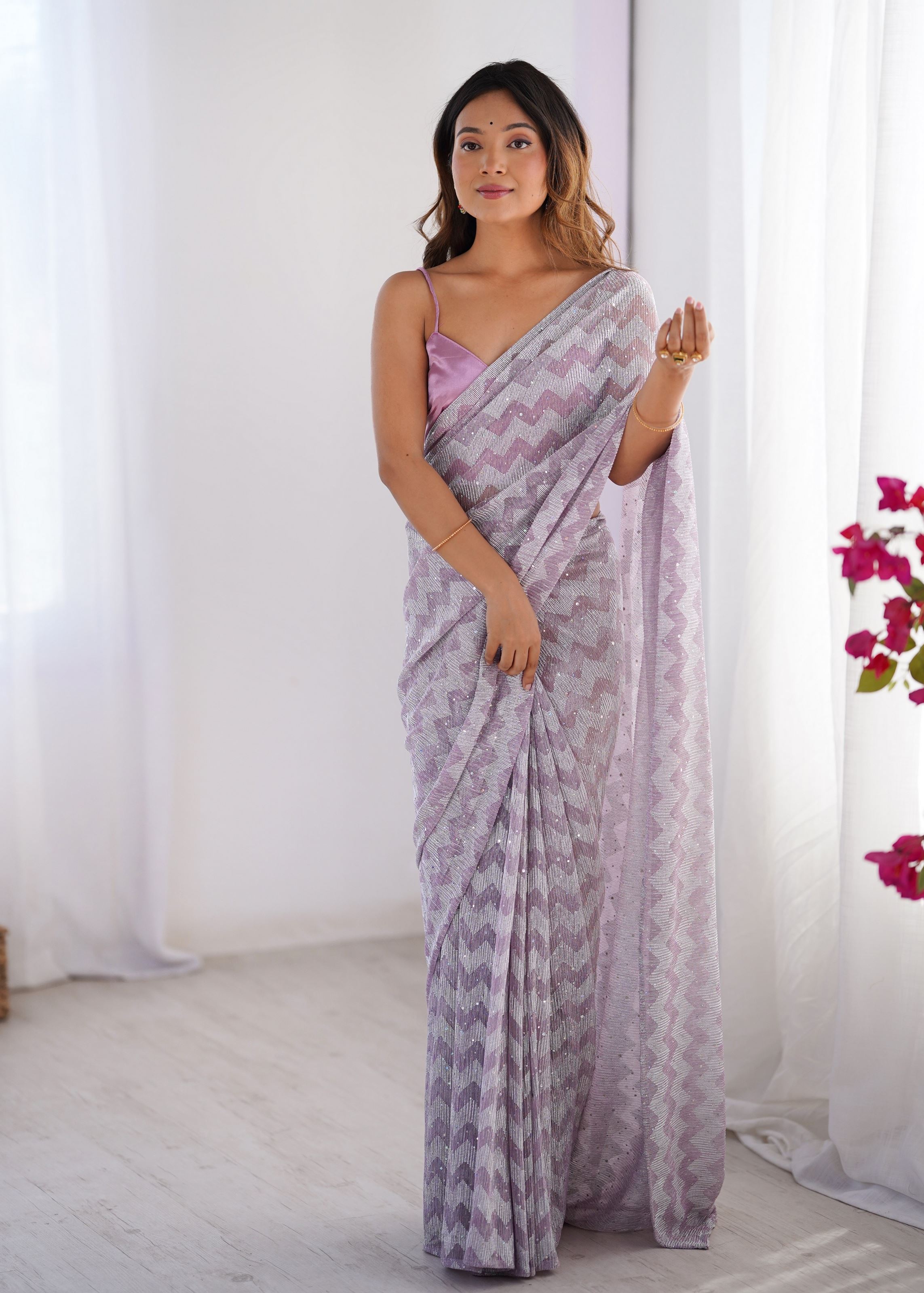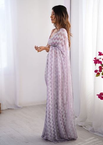 The deep purple shade symbolizes luxury and charm, making this saree an ideal choice for festive gatherings, weddings, receptions, or celebratory evenings. The woven design with stylish prints enhances its beauty, giving it a contemporary touch while retaining ethnic elegance. Its lightweight nature ensures ease of draping, making it a perfect ready-to-wear option for women who love effortless style.