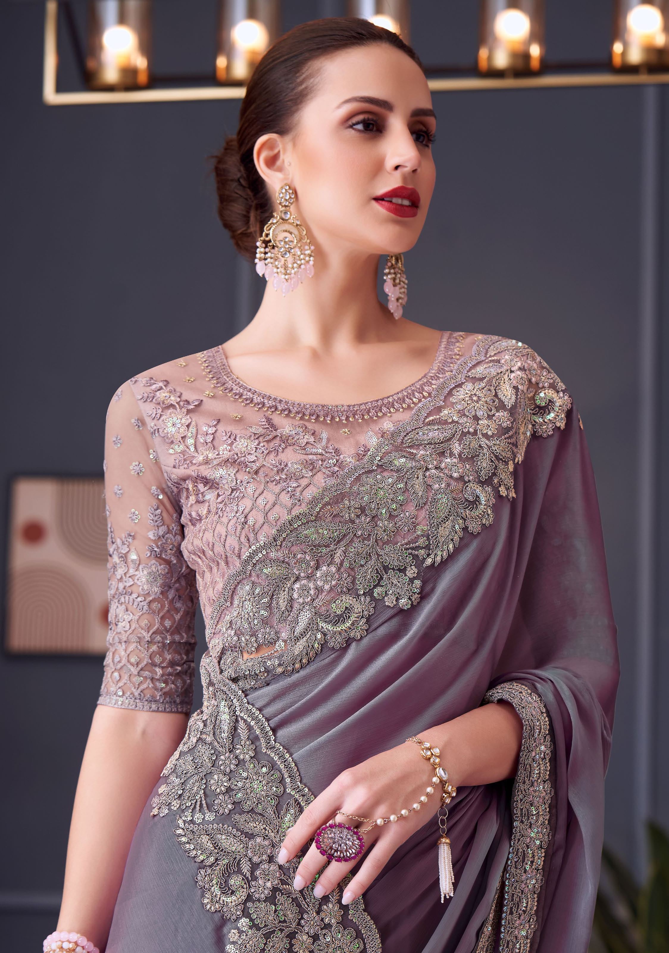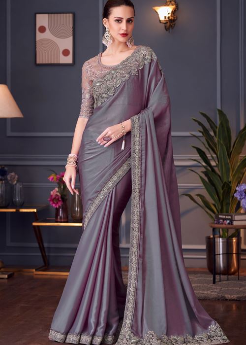 Purple Saree With Heavy Thread Embroidery Sequins Work