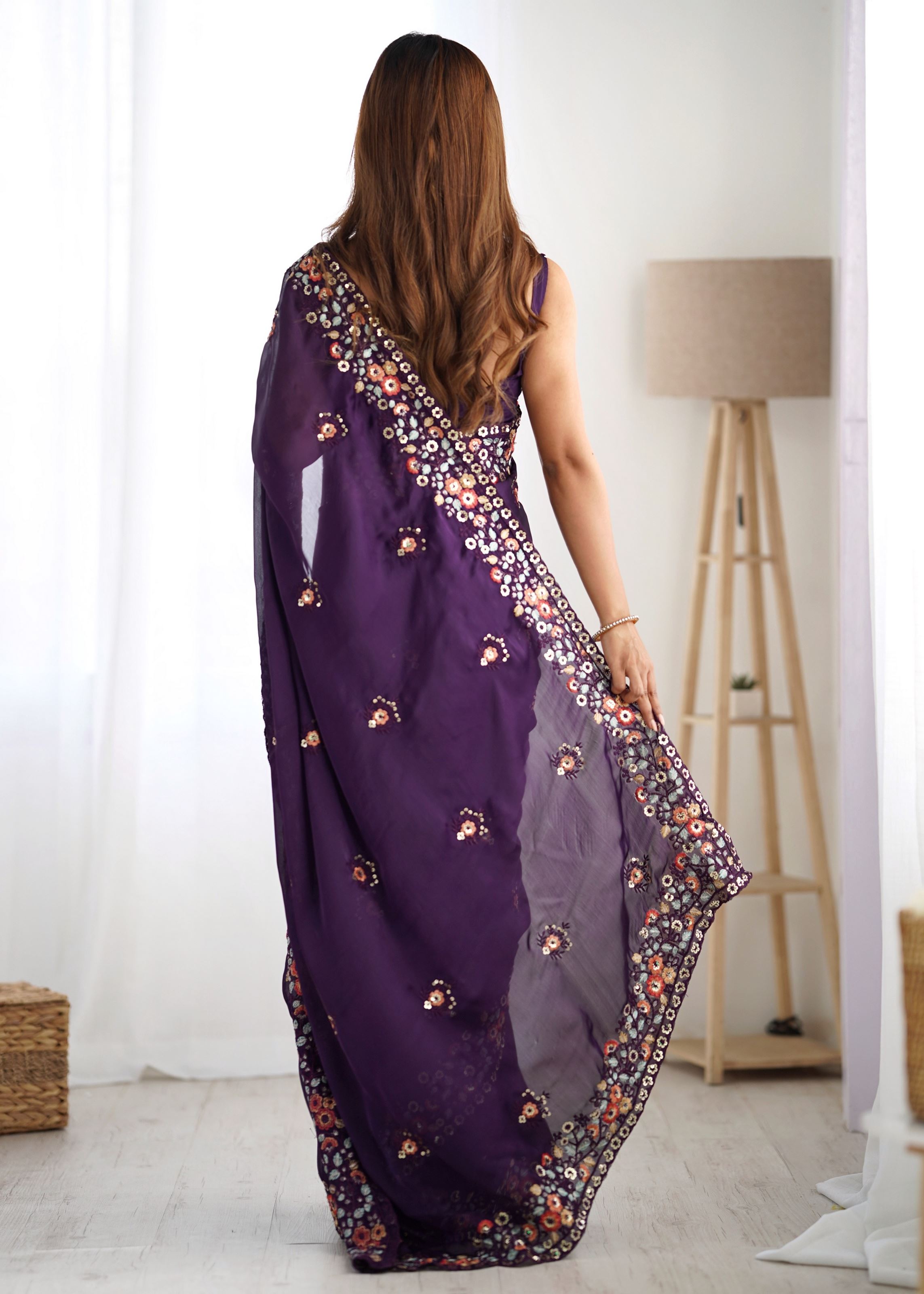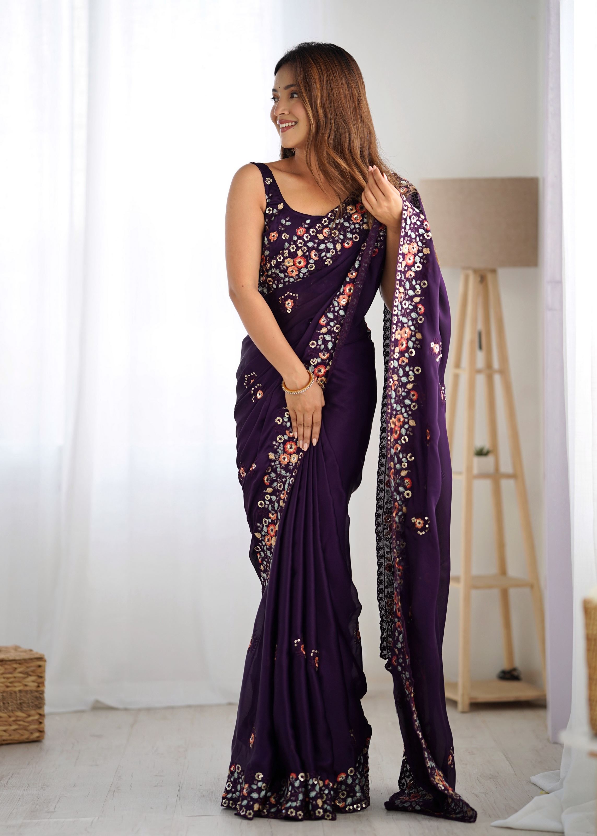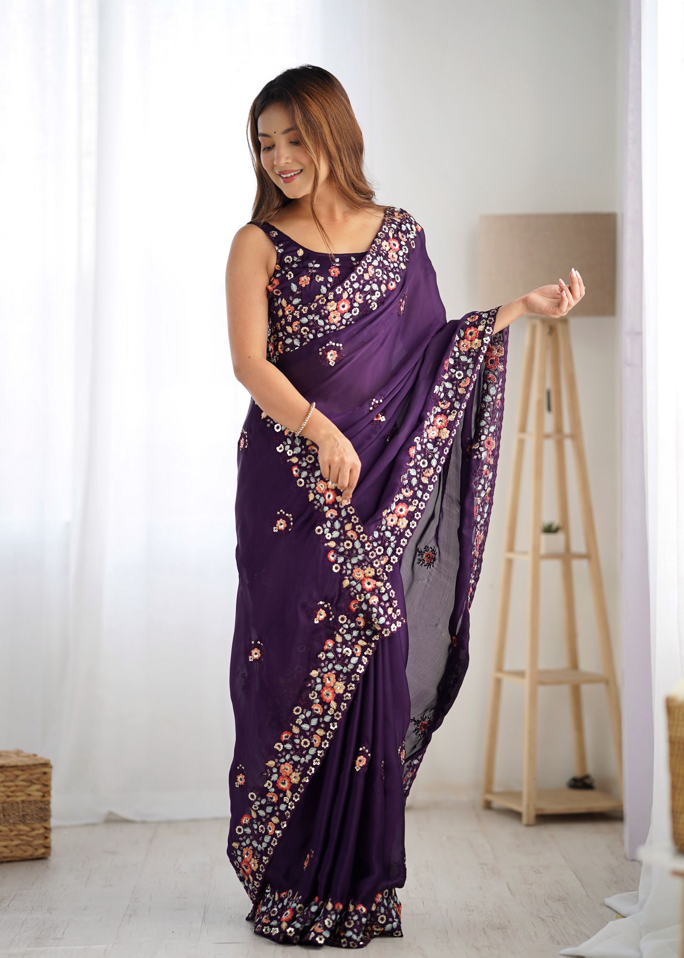 The saree includes a matching Chiffon blouse in purple, ensuring a flawless and stylish ensemble for any grand celebration. The delicate embroidery and smooth satin-chiffon blend make this saree an excellent pick for those who love designer detailing combined with timeless elegance. Pair it with diamond or kundan jewelry to create an exquisite party-ready look.