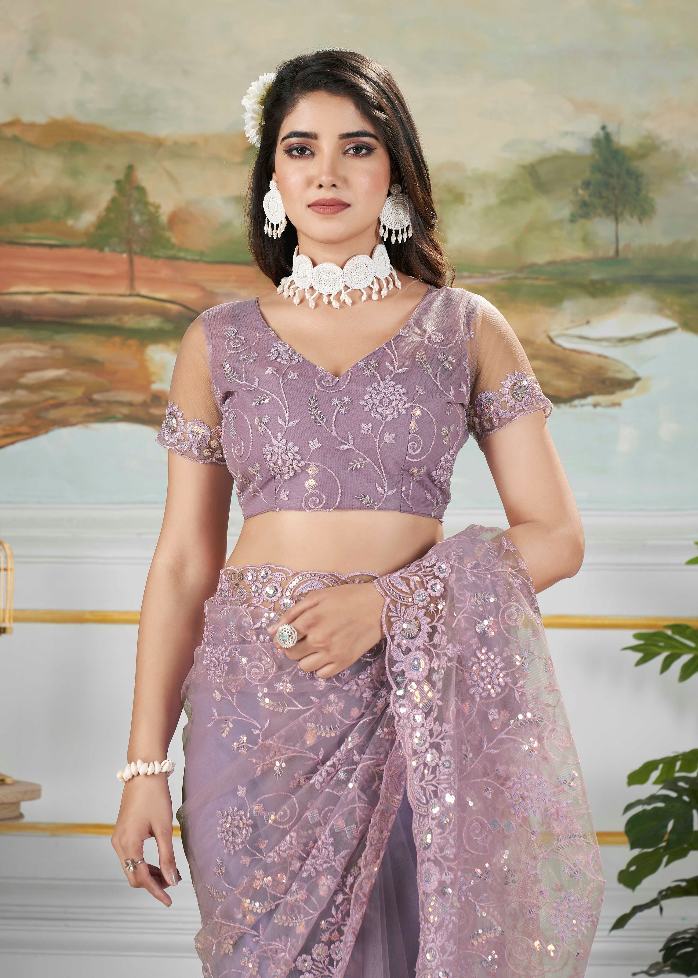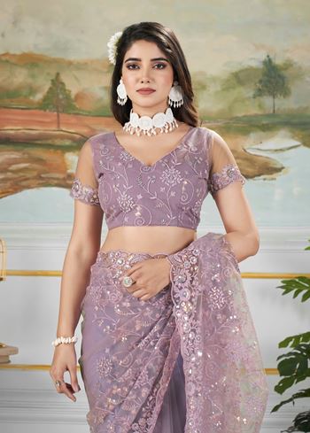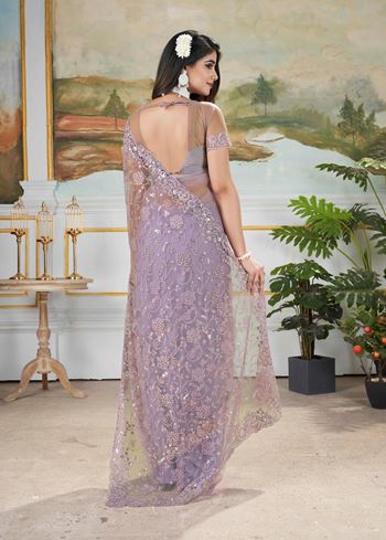 Purple Sequins With Thread Embroidery Work Butterfly Net Partywear Saree