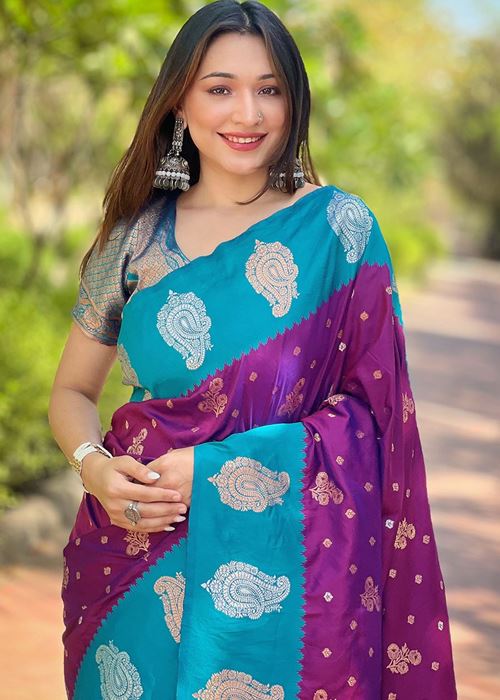 Purple Silk Blend Saree With Floral Border Zari Woven Work