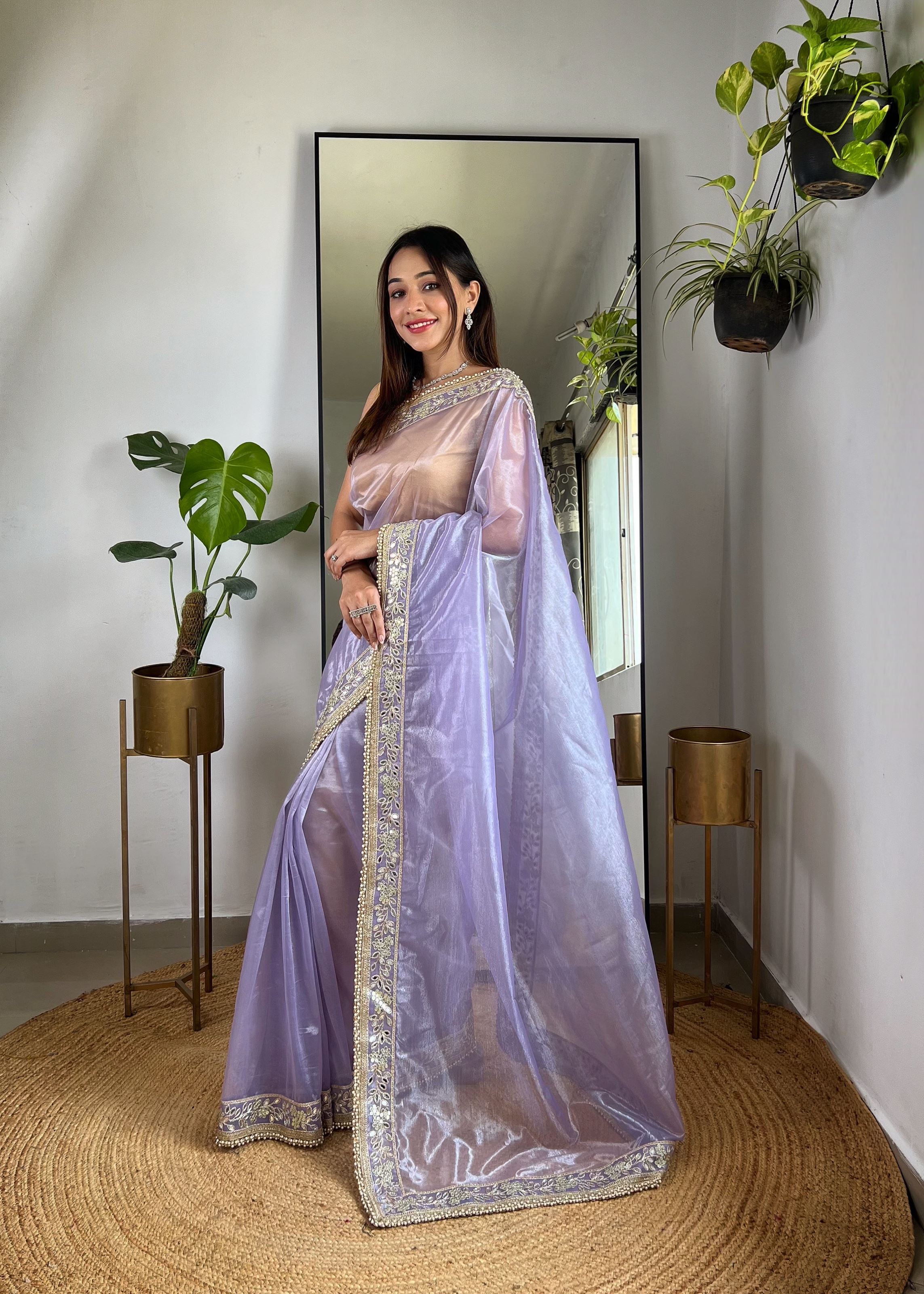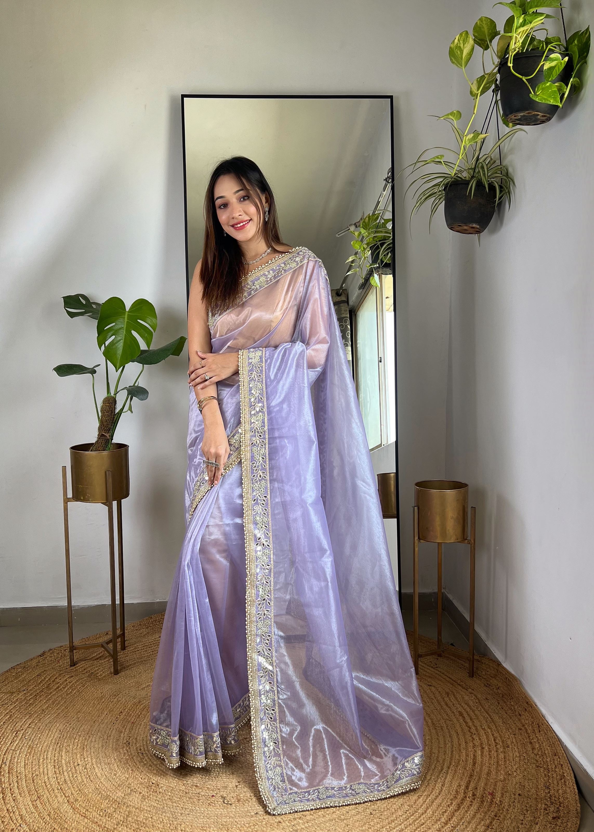 Perfect for celebrations or ceremonial gatherings, this saree pairs elegantly with statement jewelry and stylish heels, adding glamour and sophistication to your ensemble. The soft tissue silk fabric ensures a graceful flow while maintaining comfort and durability, allowing you to enjoy extended events with ease.Aethnofit Fashions offers worldwide shipping, enabling customers to buy Indian sarees online or explore designer sarees online conveniently. Elevate your ethnic wardrobe with this purple silver tissue silk saree, a timeless piece that embodies festive elegance, designer craftsmanship, and luxurious ethnic charm.