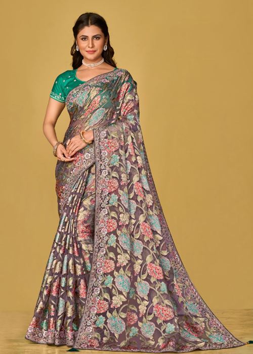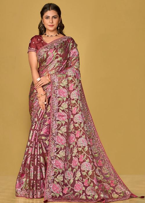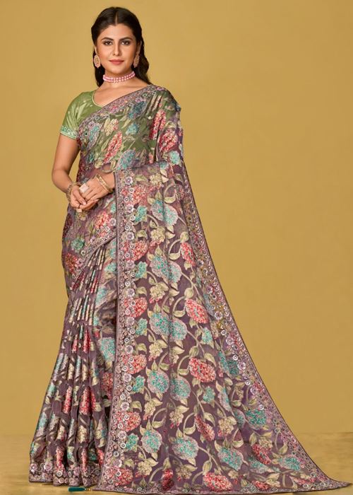 Purple Soft Organza Brasso Saree With Printed Saree With Piping, Embroidery Sequins Work