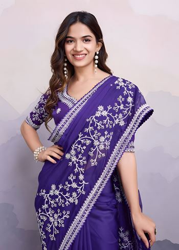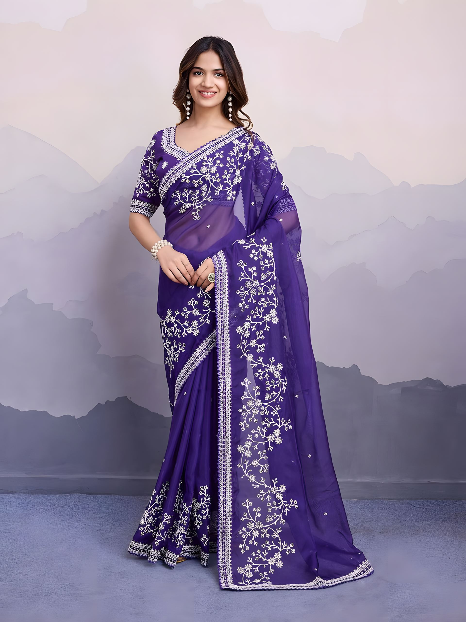 Crafted from premium Taby Organza Silk, the saree offers a feather-light drape with a sheer finish that moves like a whisper. The embroidery is thoughtfully placed, adding texture and sophistication while preserving the organza's airy elegance. A matching purple blouse in Mono Banglory Silk accompanies the saree, lending structure and contrast to the fluid drape.