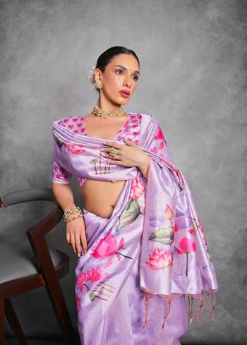 The rich purple hue is a symbol of regality and sophistication, elevated with delicate printed patterns that bring a touch of artistry to the design. Accented with a fine zari border, it adds a subtle gleam, making this saree perfect for both casual elegance and festive finesse.