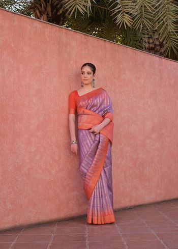Adorned with finely woven ethnic motifs, this saree celebrates Indian craftsmanship in its purest form. Each motif reflects a tale of tradition, beautifully offset by the bold vibrance of the contrast orange pallu, which injects energy and festive charm into the ensemble. The striking color contrast creates a perfect visual balance—refined yet eye-catching.