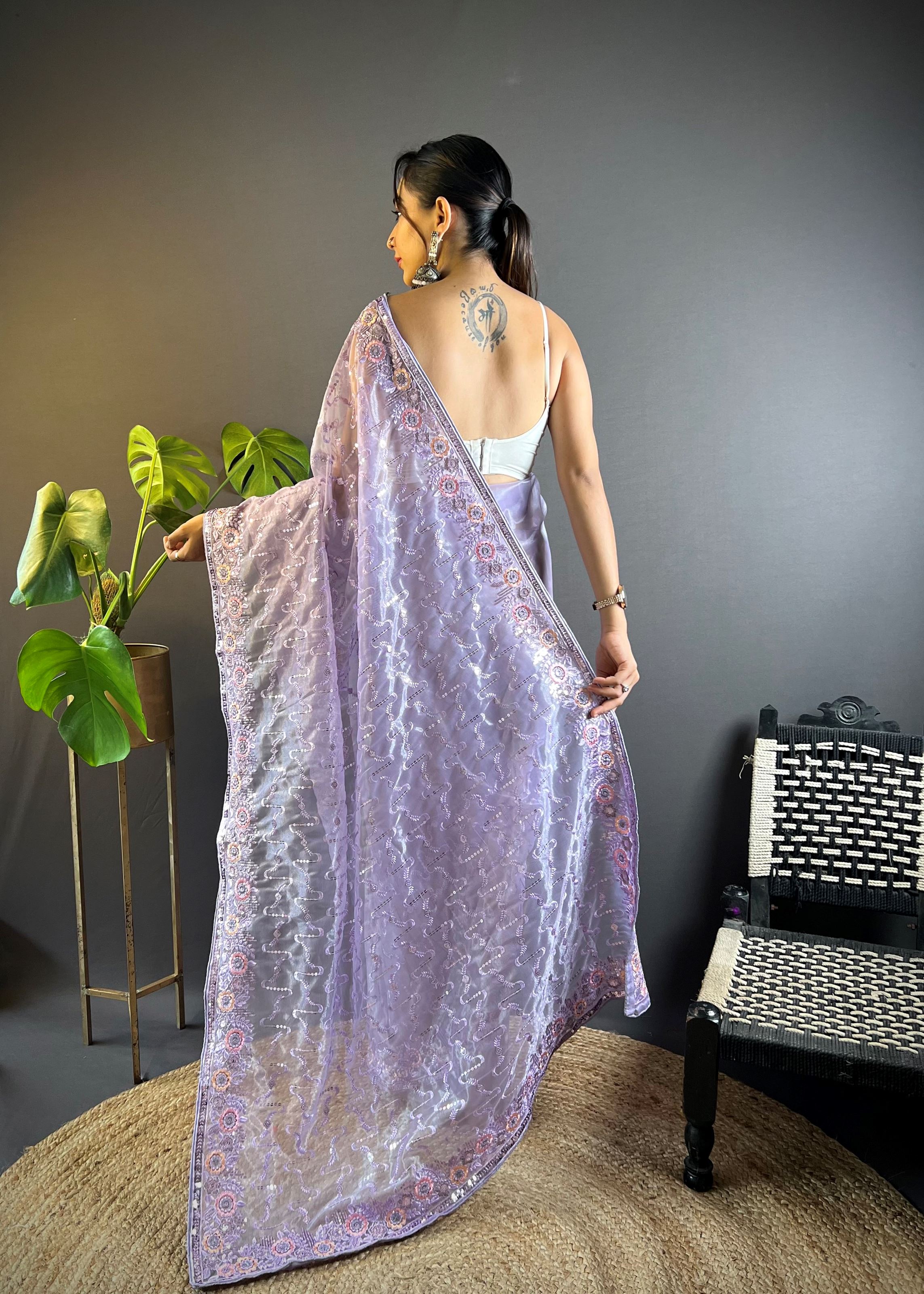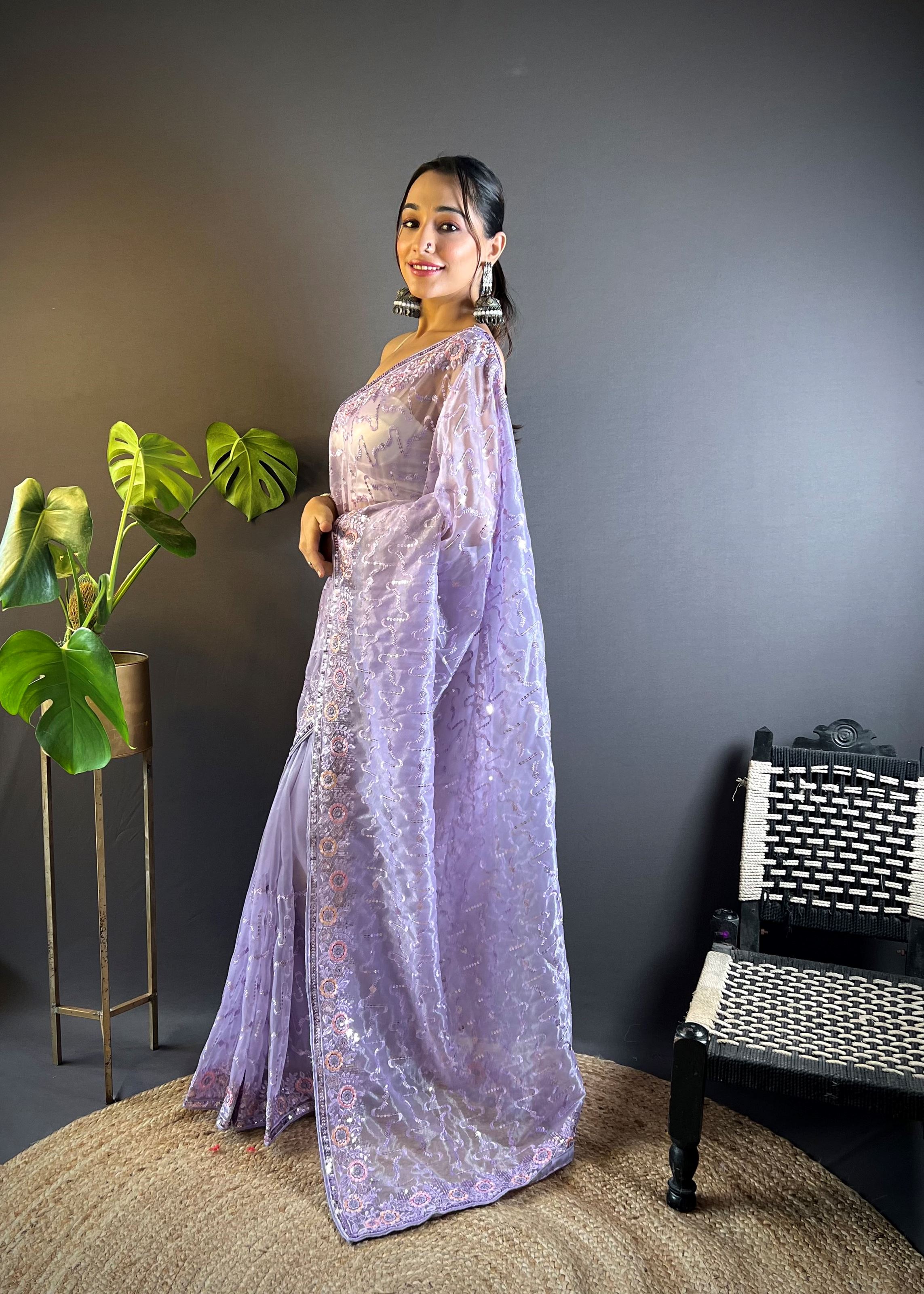This saree comes with a matching purple net blouse that complements the embroidered detailing beautifully. The lightweight net fabric makes draping effortless while ensuring all-day comfort, so you can enjoy your special occasions without compromise. Pair this saree with statement jewelry in silver, gold, or kundan to create a truly glamorous look that suits both traditional and contemporary styling.