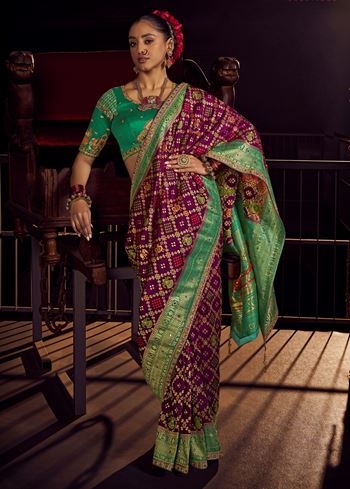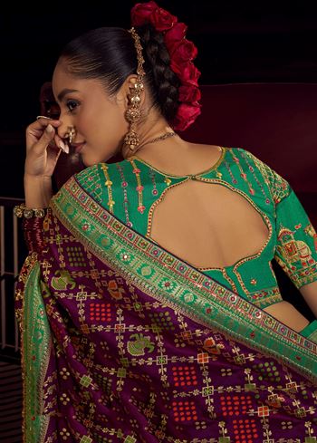 The ensemble is paired with a contrasting Rama Green blouse, tailored in the same premium viscose dola fabric. The blouse is adorned with hand work embroidery, adding texture and depth to the set. The bold color contrast between the royal purple saree and the vibrant green blouse creates a visually stunning look—ideal for wedding events, festive occasions, or evening celebrations where you want to leave a lasting impression.
