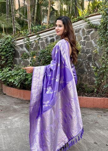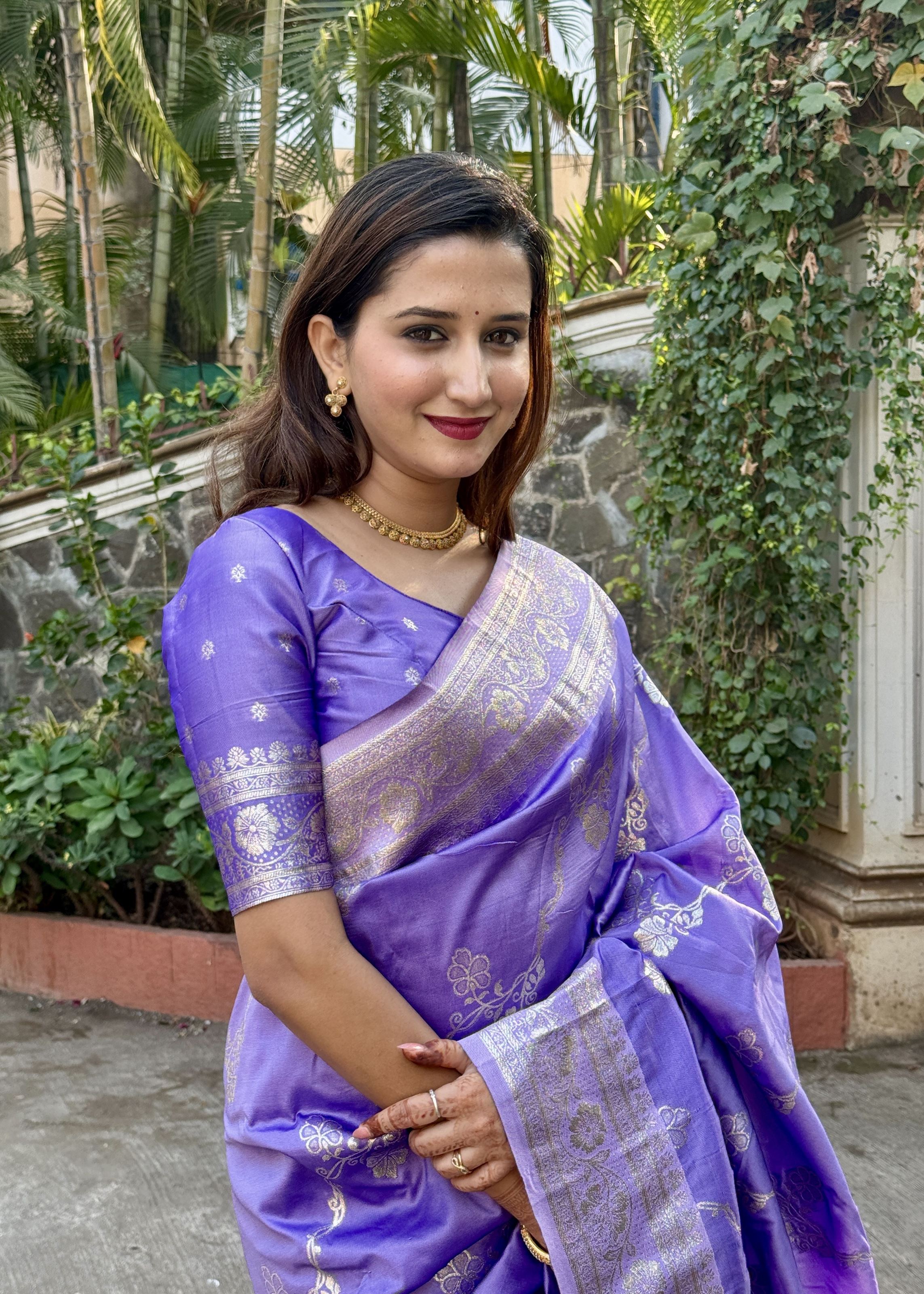 Paired with a matching purple silk blouse, this saree ensures a coordinated and elegant look. The lightweight yet rich Banarasi silk fabric allows for graceful draping and all-day comfort, making it ideal for long celebrations. Accessorize with statement jewelry, elegant heels, and ethnic accessories to complete a festive-ready outfit that leaves a lasting impression. Designed for women who value authentic silk artistry, this saree combines timeless tradition with contemporary elegance.