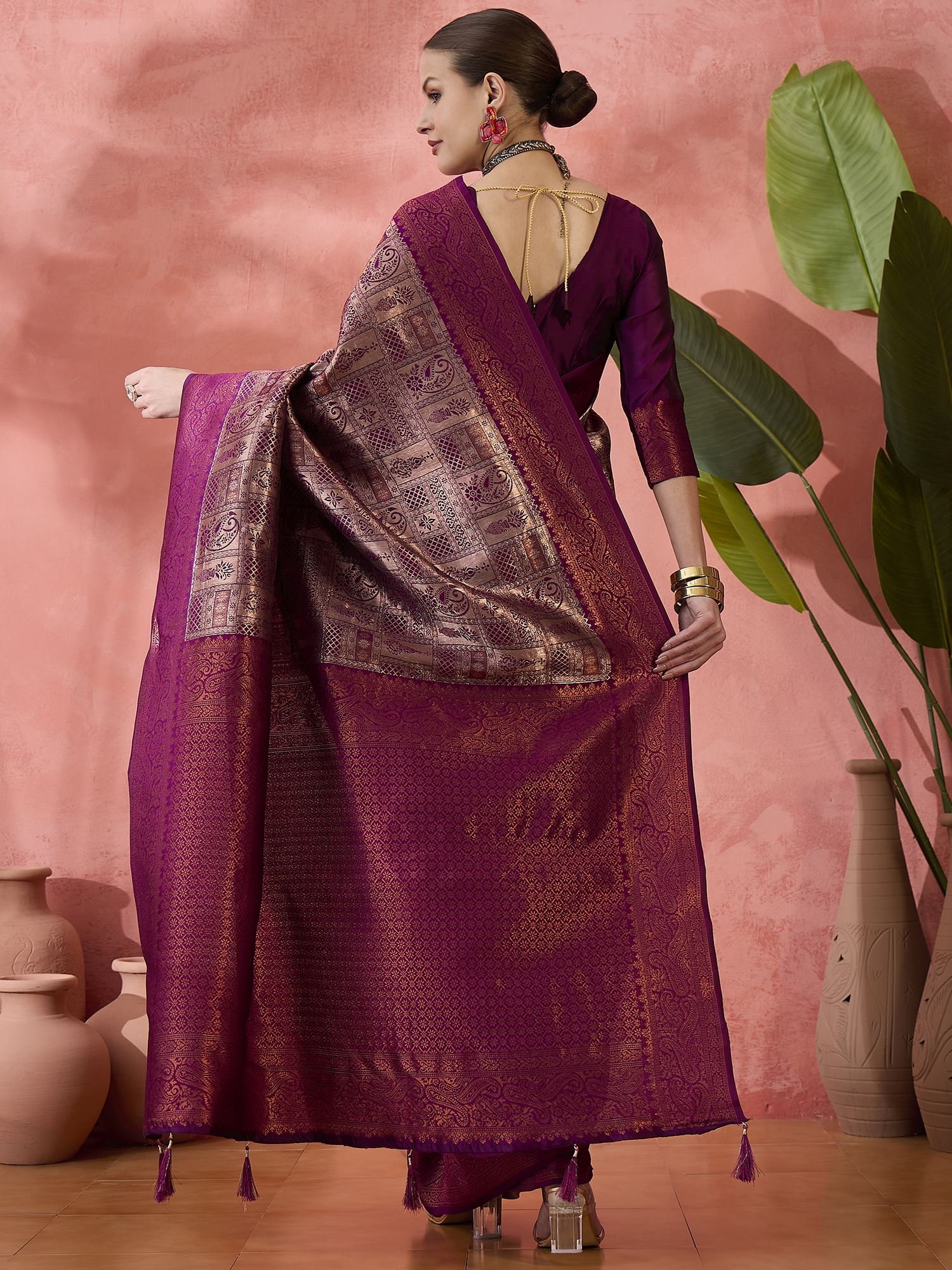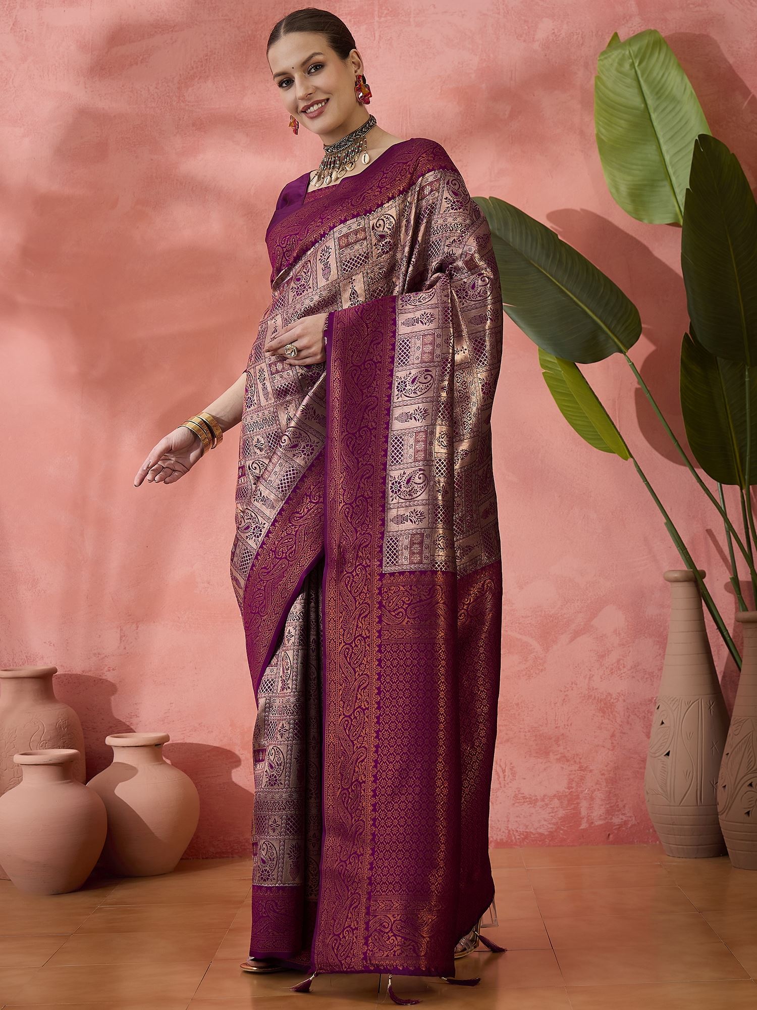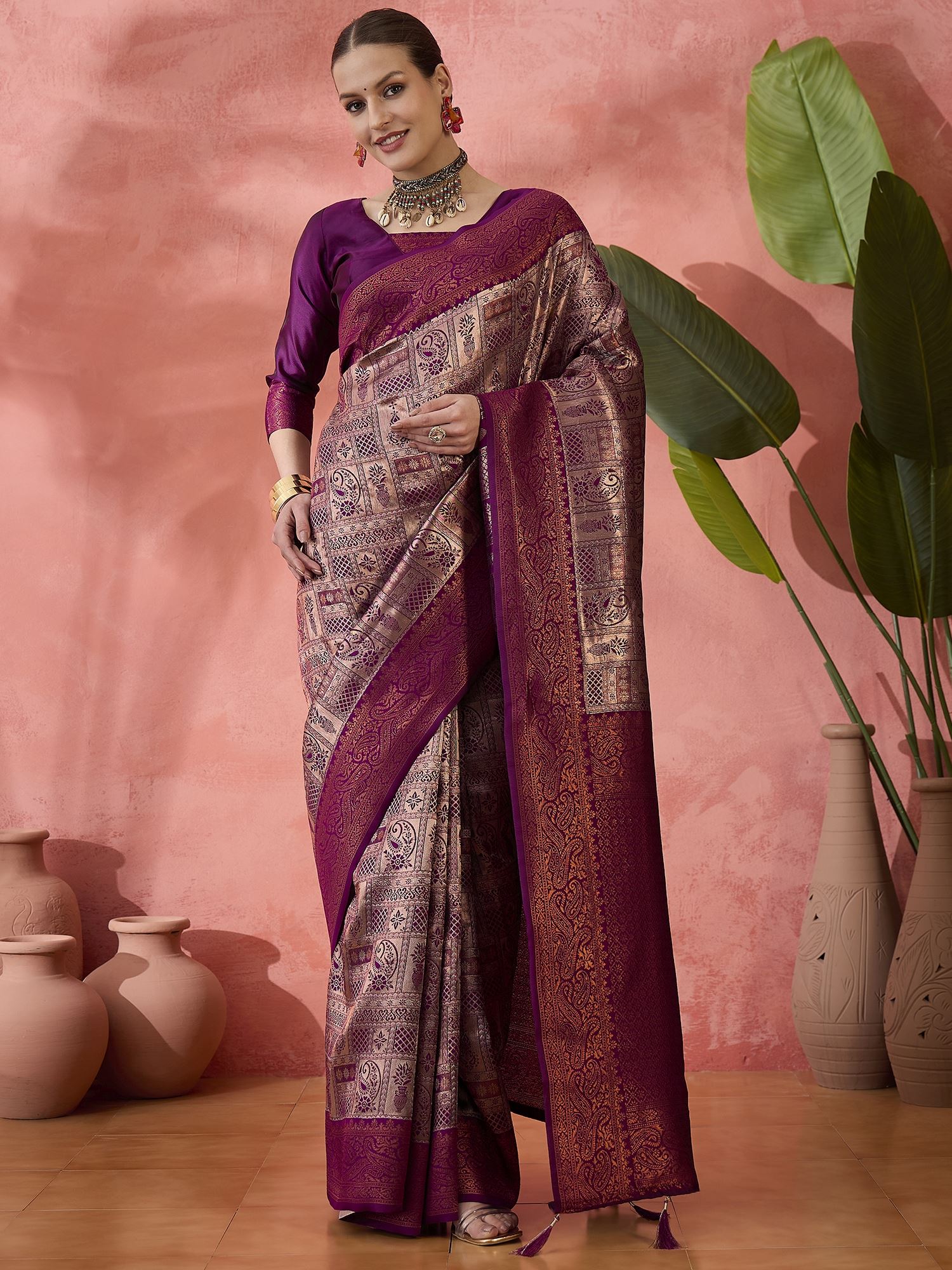 This saree is complemented by a matching silk blend blouse in purple, which can be tailored to suit your personal style. The harmonious blend of color and texture ensures a stunning and cohesive look, perfect for any celebratory event.