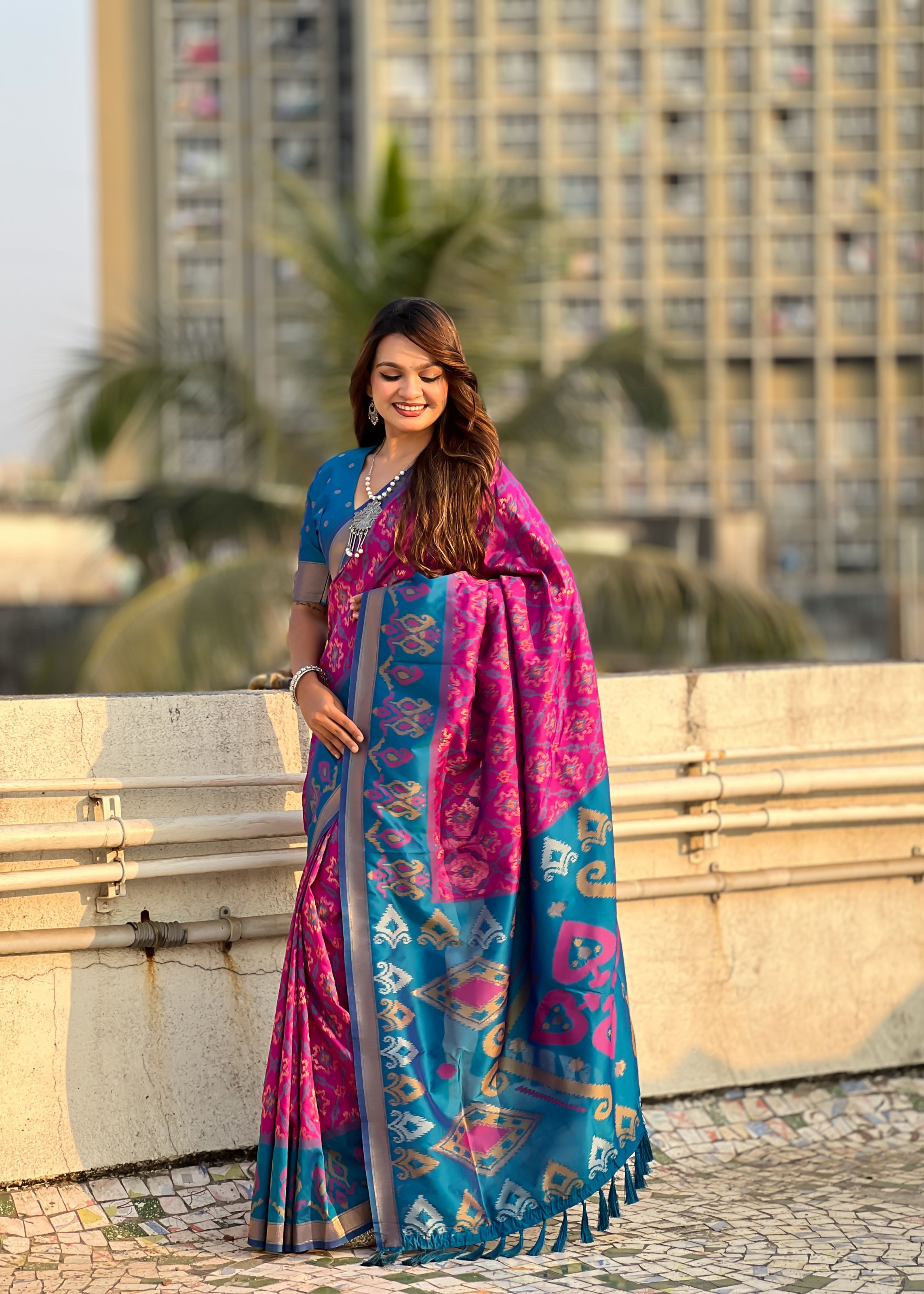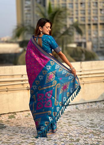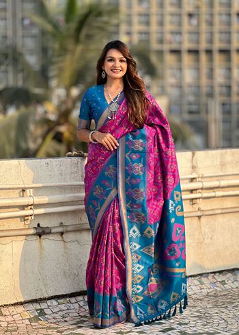 Make a statement at every festive occasion with the Purple Woven Meenakari Ikkat Designer Patola Silk Ceremonial Saree from Aethnofit Fashions. Crafted from premium Patola silk, this saree features exquisite Ikkat weaving enriched with delicate Meenakari work, giving it a luxurious and sophisticated appearance. The rich purple body paired with a contrasting blue silk blouse creates a regal and eye-catching ensemble, perfect for weddings, parties, and special celebrations.