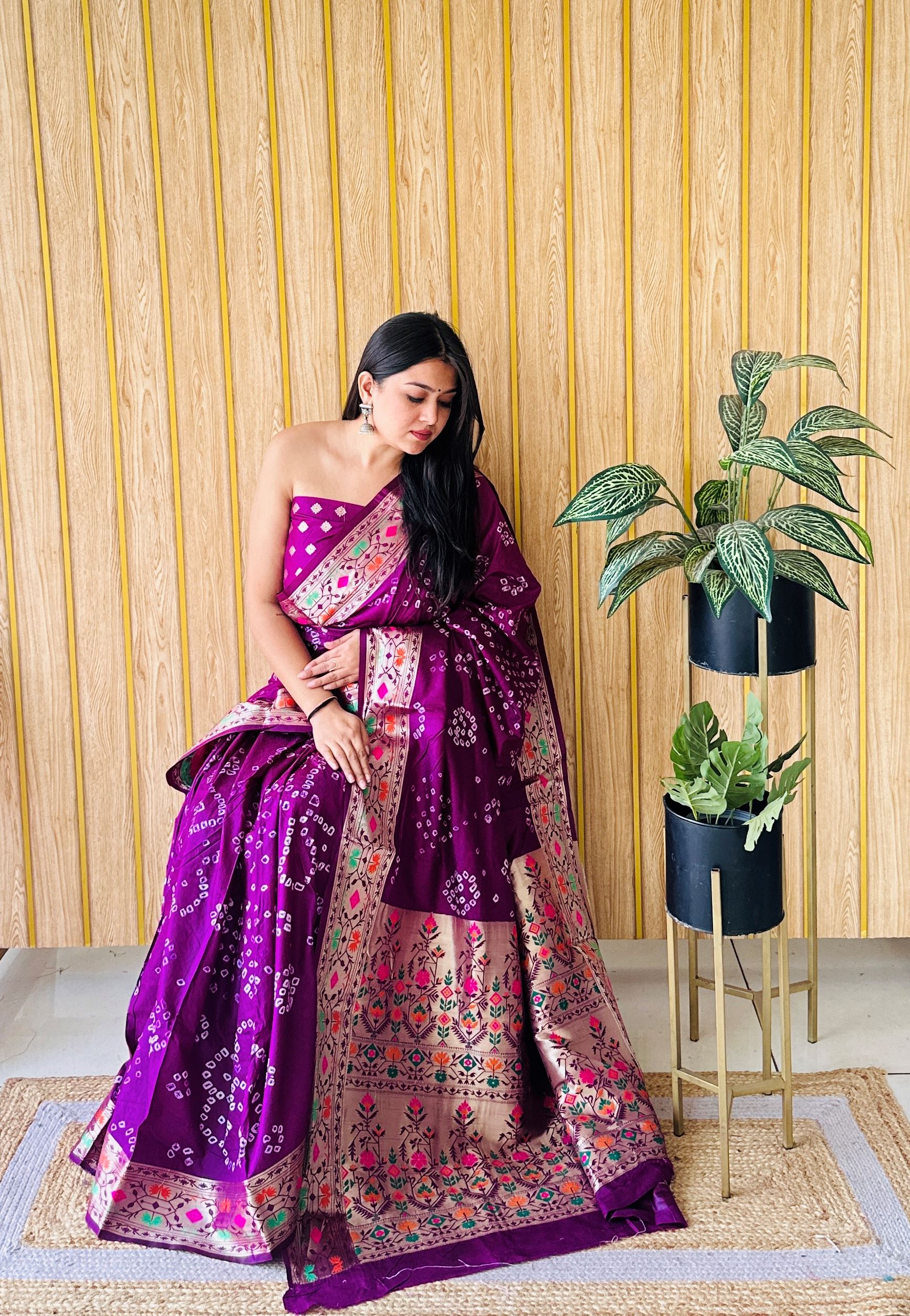 The royal purple hue symbolizes luxury, elegance, and divine grace, while the intricate Paithani weaving technique enhances its timeless appeal. Adorned with exquisite Bandhej-inspired patterns, this saree seamlessly unites two celebrated textile arts, creating a masterpiece of tradition and modern finesse. The zari-woven border and grand pallu add a regal touch, making it ideal for ceremonial dressing.