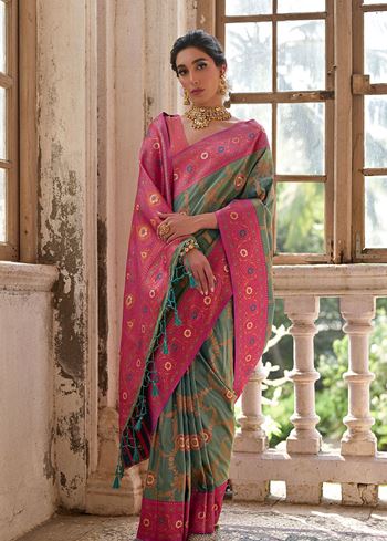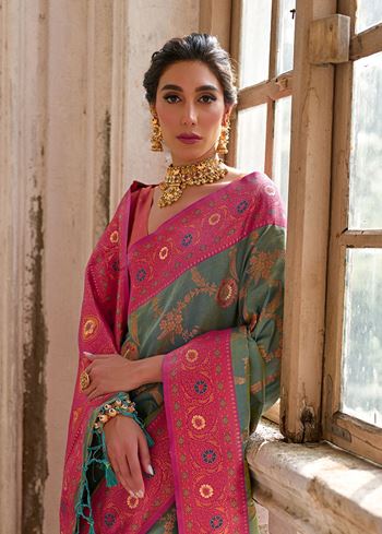 Indulge in regal sophistication with this Rama Banarasi Silk Saree with Floral Jal and Contrast Pallu from Aethnofit Fashions. Crafted from exquisite Banarasi silk, the saree showcases a rich rama green base adorned with intricately woven floral jal motifs that reflect centuries-old weaving artistry. The vibrant pink contrast pallu brings a vivid burst of elegance, while the matching pink Banarasi silk blouse adds balance and charm to this luxurious drape.
