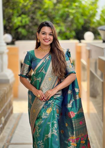 This saree comes with a matching green silk blend blouse, designed to complement the saree’s elegant appeal. Pair it with classic temple jewelry, a neat hairstyle, and embellished footwear for a truly regal look.Ideal for wedding receptions, festive gatherings, and grand cultural events, this Banarasi Silk Woven Saree is more than just attire—it’s an embodiment of tradition, elegance, and timeless fashion.